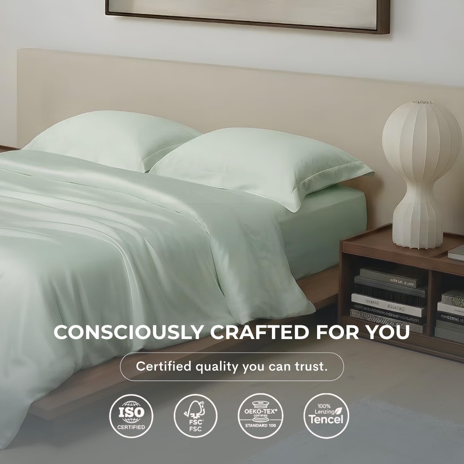 RESPONSIBLY-SOURCED: Rest easy knowing our Eucalyptus Tencel Lyocell is OEKO-TEX 100 certified, ensuring it’s free from harmful substances. Complying with ISO standards and sourced responsibly per SEDEX guidelines, this duvet cover set guarantees your well-being.