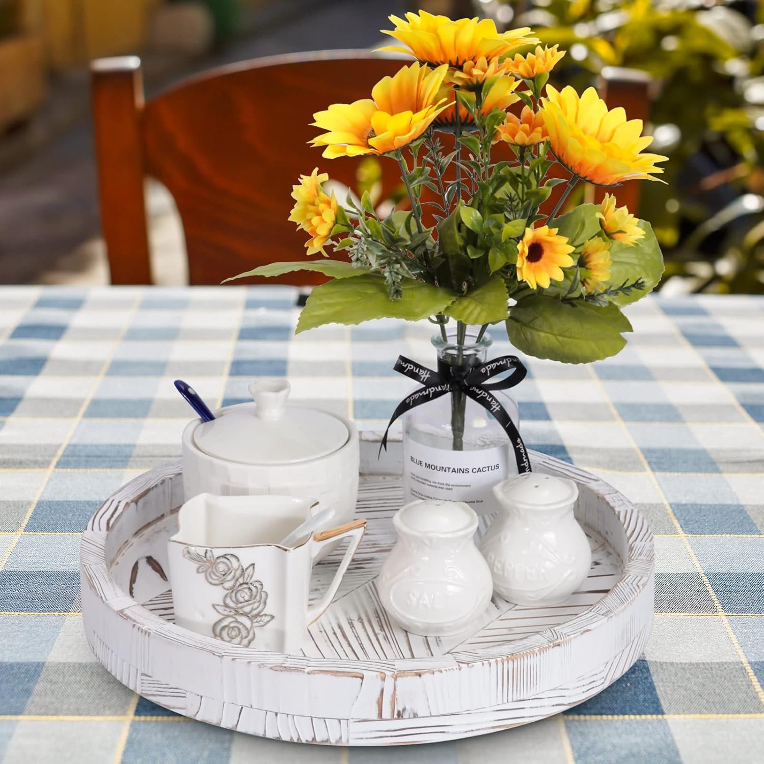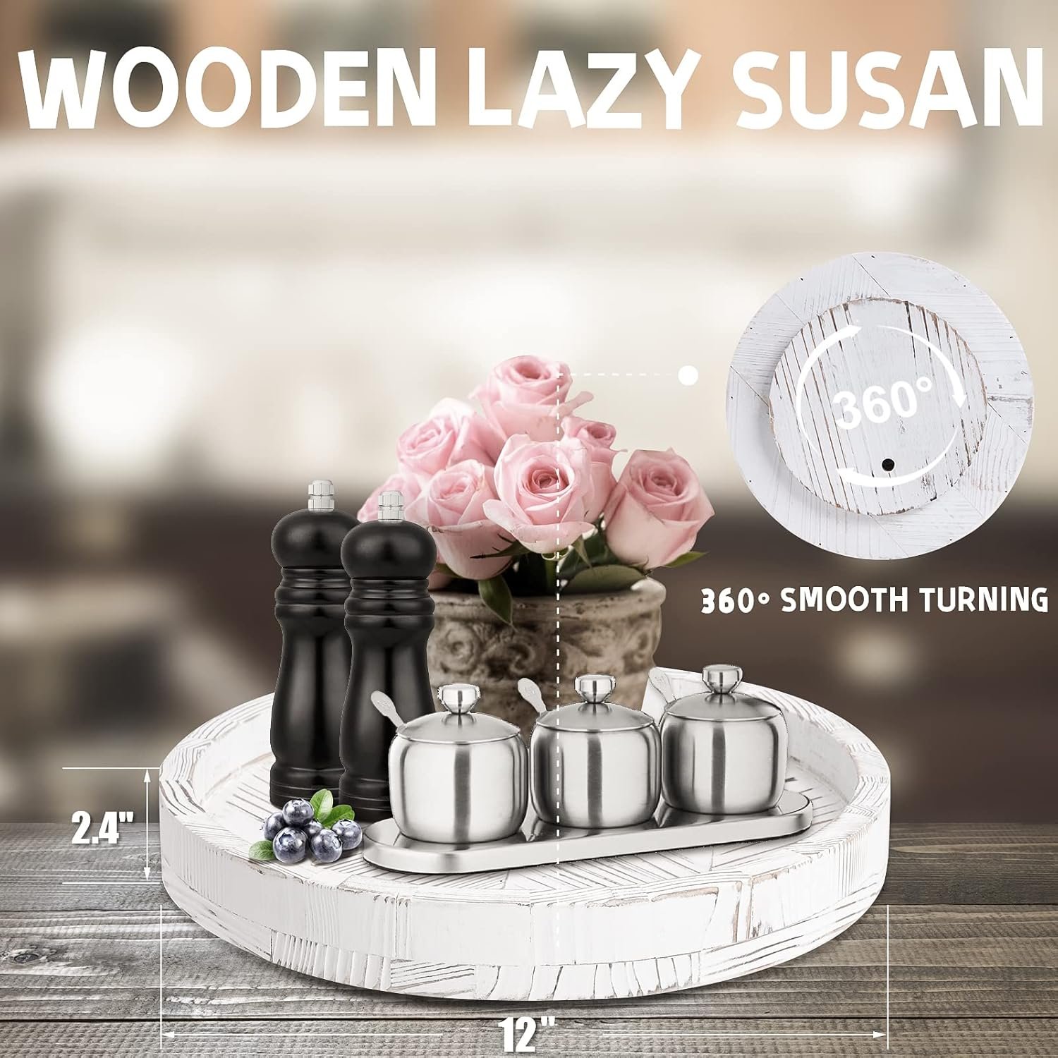 Farmhouse Decor Centerpiece:Rustic wood lazy susan are carefully crafted from high-quality wood. Distressed wood finish complements any presentation, adding a warm farmhouse look to any display