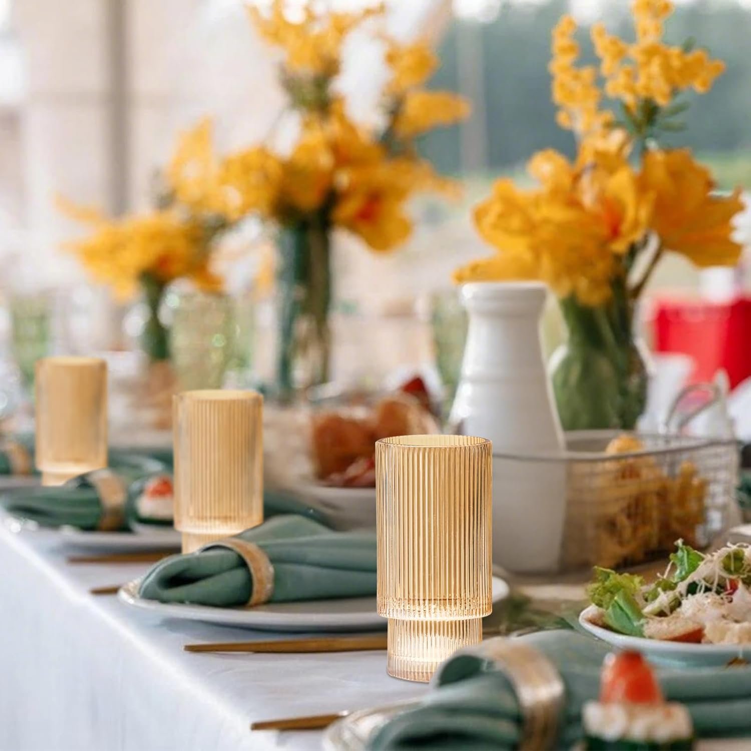 3 reviews for 12 oz Ribbed Drinking Glasses Set of 6, Clear Vintage Iced Coffee Cups Elegant Glassware, Highball Glass Cups Ridged Glass Tumbler for Cocktail, Whiskey, Beer, Water, Juice, Origami Style Amber
