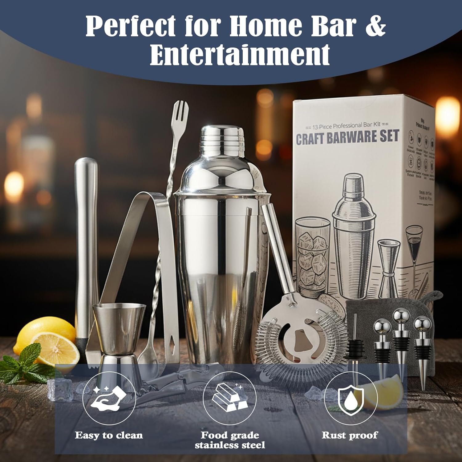 【Complete Bartender Kit with 13 Essential Tools】 Includes a 750ml Boston shaker, jigger, bar spoon, cocktail muddler, ice tongs, wine opener, cocktail strainer, 3 pourers & 3 stoppers — everything a home bartender or professional mixologist needs.