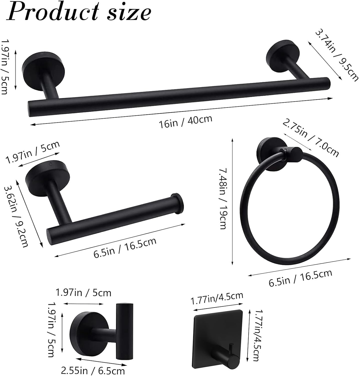 14 Pieces Combination – 2 x 16 inches towel bar, 2 x Toilet paper holder, 2 x Towel ring, 4 x Robe & towel hooks, 4 x Adhesive hooks.