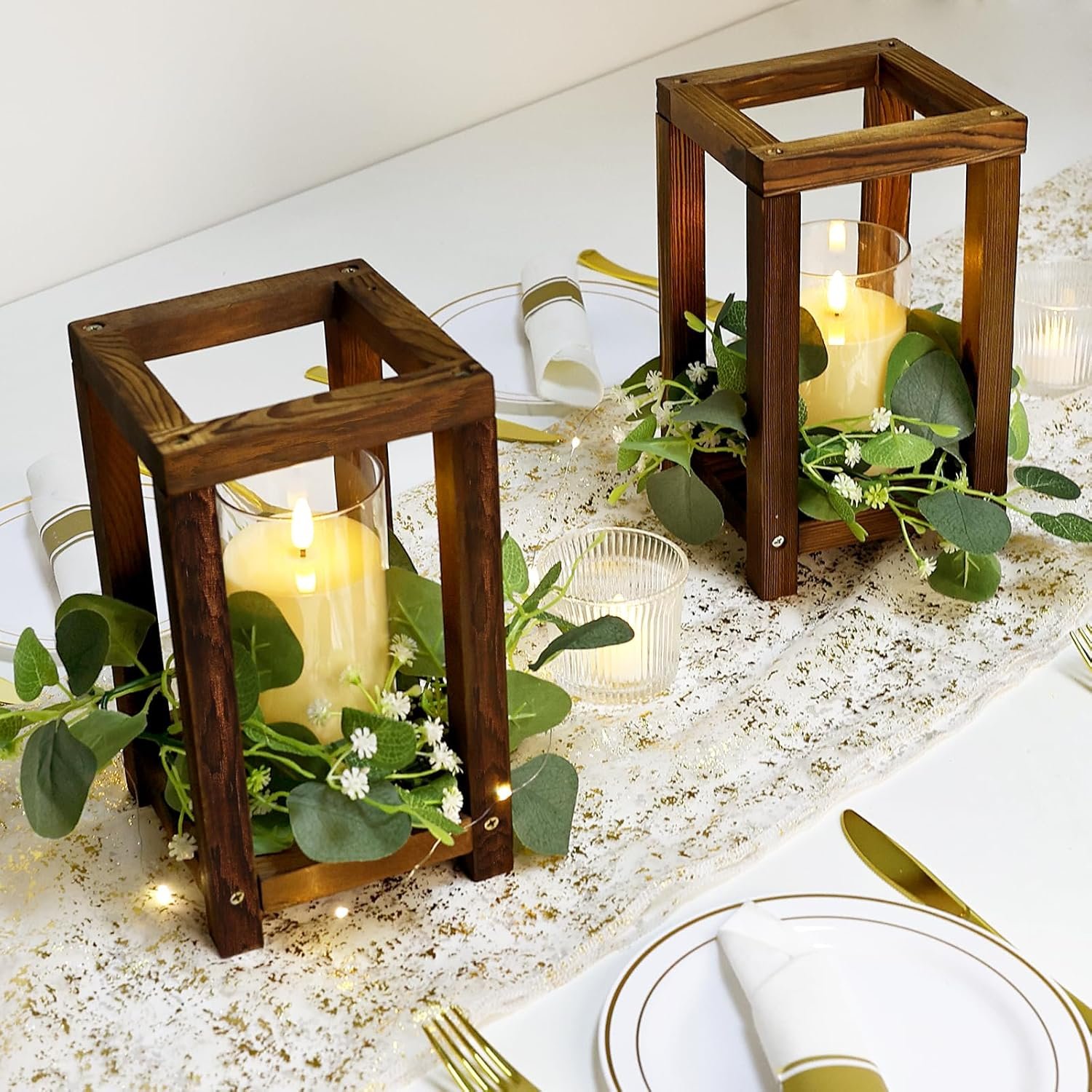 These wedding lantern centerpieces combine artificial eucalyptus leaves with LED candles, emitting a warm glow through wooden lanterns to add a cozy charm to dinners, banquets, or parties.