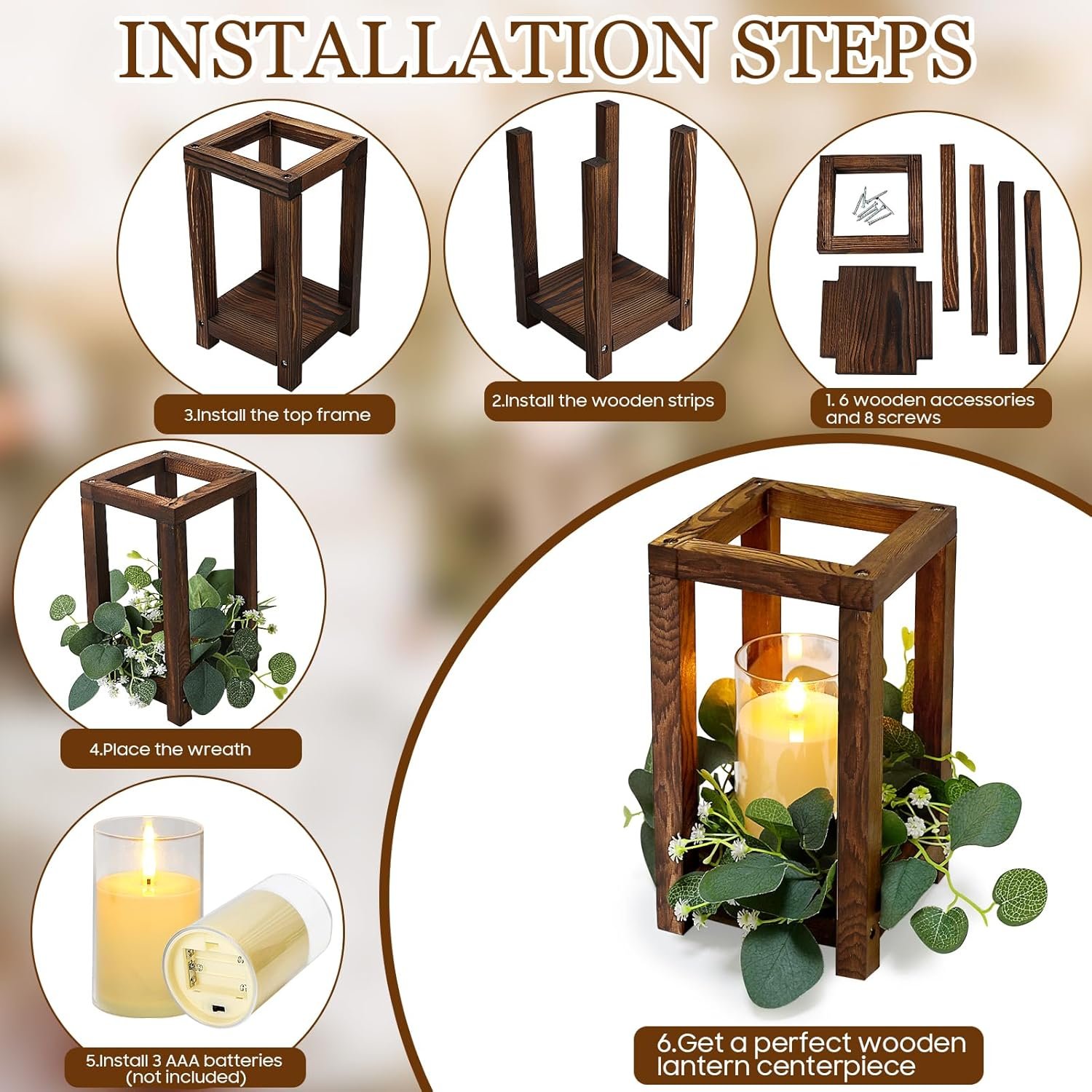 Wooden wedding lanterns are easy to use, simply assemble these lantern candle holders, place the wreath and LED candles inside (each candle needing 3 AAA batteries), and you can craft a perfect farmhouse candle lantern centerpiece.