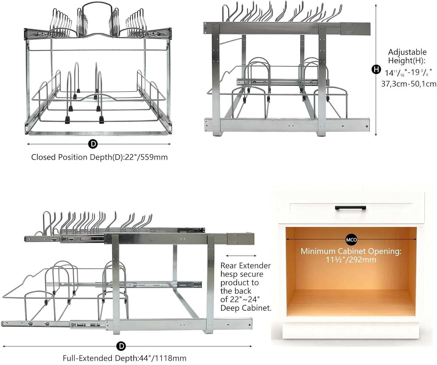 Pull Out Cabinet Organizer for Pot Pan and Lid Organization: The 2 Tier pull out Pot and Pan organizer size is 20½”W x 22″D; make sure your cabinet opening is 20½” and above.