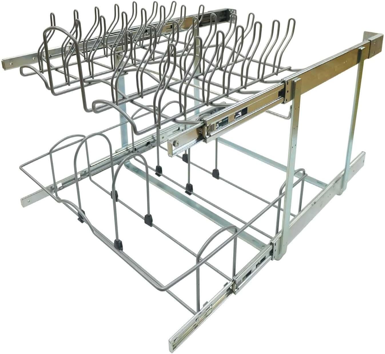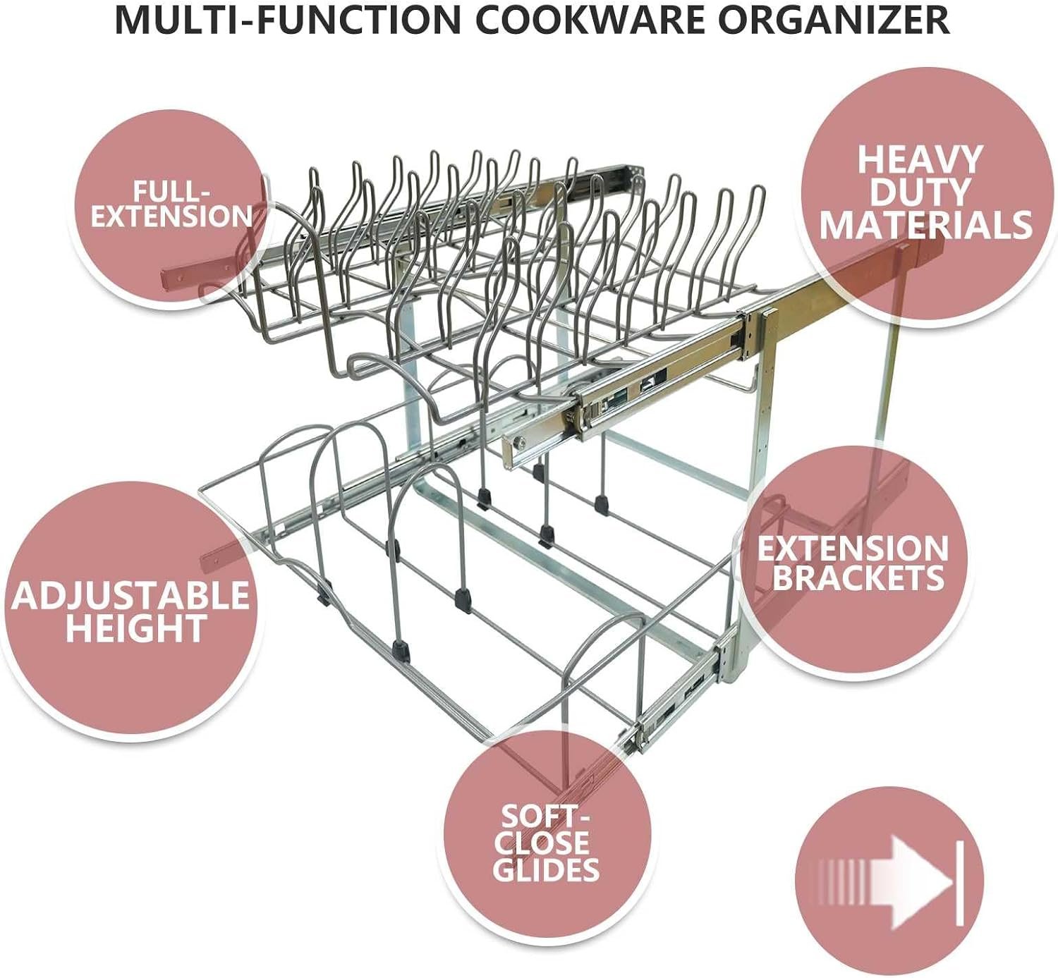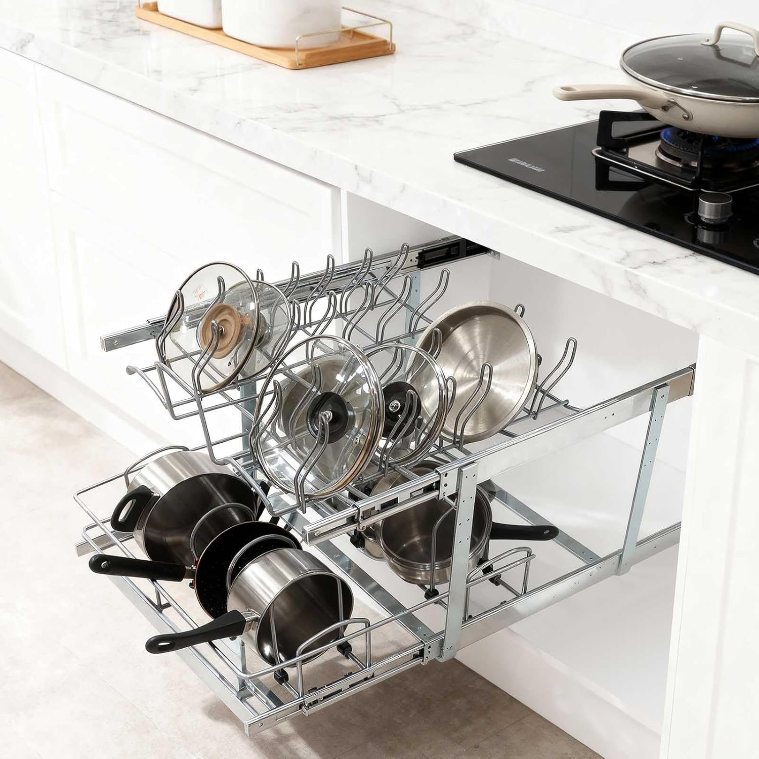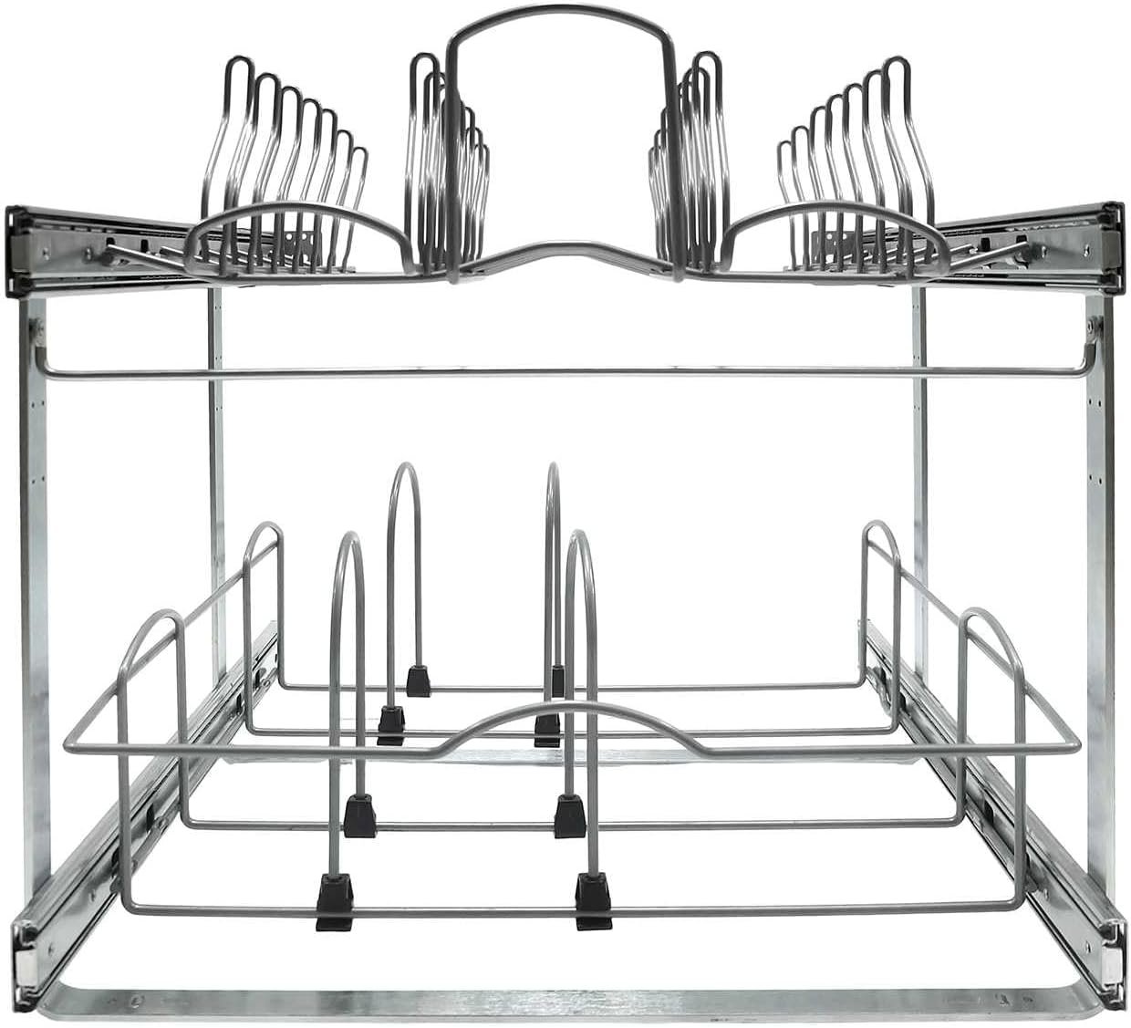 Convenient Pot Pan and Lid Organizer: This smart pull out pot pan and lid organizer is an ideal solution to your cookware organization. It features 2 tier individual sliding out or pull-out, bringing in easy access to your cookware stored under your base cabinet.
