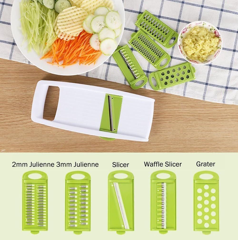 [5-in-1 Versatility] 5 interchangeable blades meet your Slicing ,Shredding& Grinding needs.Including 3mm Straight Slicer,2mm Shredder,3mm Shredder,Waffle Slicer and Ginger Grater.By adjusting the angle of vegetables, slender strips with different lengths can be obtained.The ginger grater can quickly grind ginger or garlic.It is a good helper for making salad