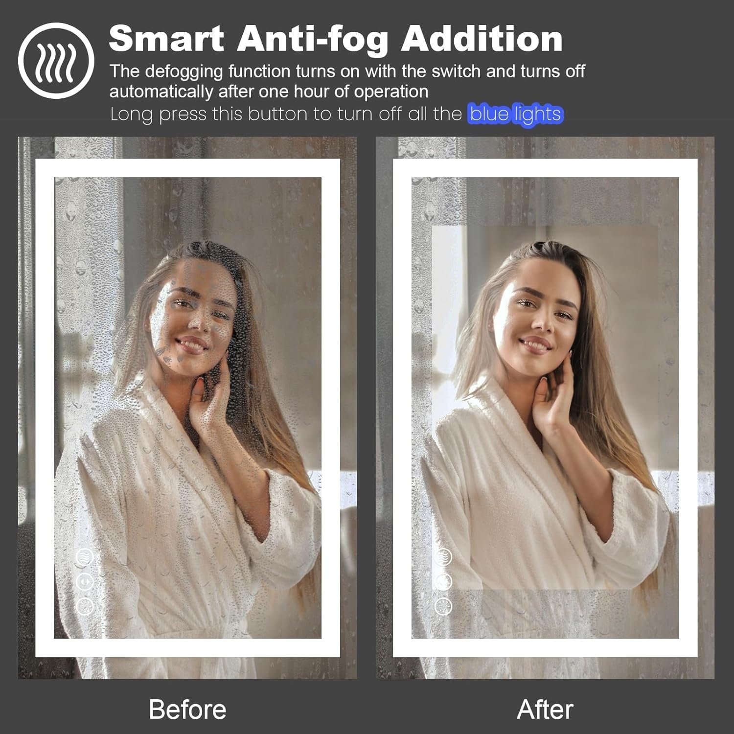 [Anti-fog]: After a few minutes of opening the defogger, the heater in the mirror will disperse the fog from the center to sides, the mirror will still reflect clearly in the bathroom surrounded by hot air; It will turn on with the power on and automatically turns off after 1 hour
