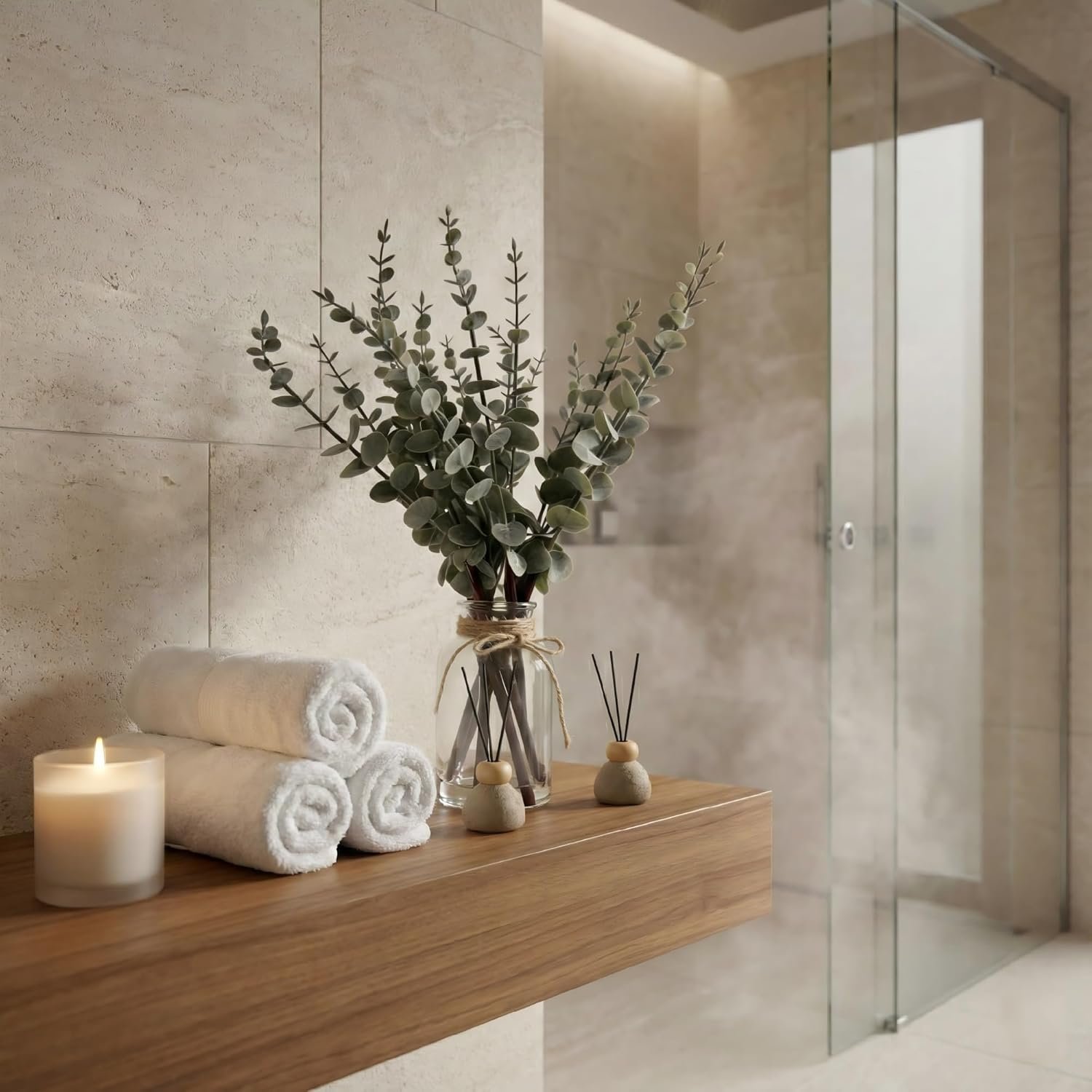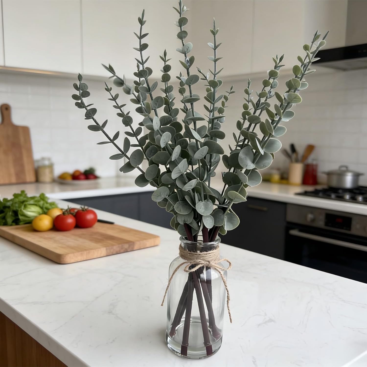 artificial eucalyptus stems add such a cute decorative touch to any space. While they’re not the most ultra-realistic greenery out there, they definitely look good for the price …especially considering they come arranged in a glass vase.The shade of green is really pretty and fresh, making them a nice accent piece for shelves, bathrooms, entry tables, or office spaces. They did arrive slightly curved at the top from being packaged, but it wasn’t a deal breaker and can be adjusted a bit. They’re a decent size and appear durable as they’re not flimsy at all.Overall, they serve their purpose well and add a simple, stylish element to the room without the upkeep of real plants. A great option if you’re looking for affordable, low-maintenance décor.