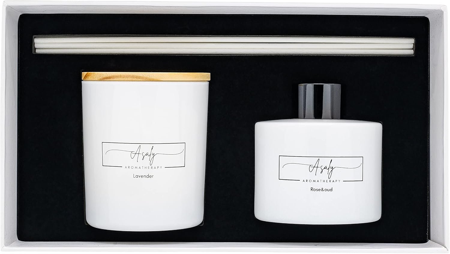 Be the first to review “ASALY Luxury Scented Candle Gift Set, 1 Scented Candle (Lavender) and 1 Reed Diffuser (Rose Oud). for Chirstmas, Birthday, Anniversary, Mothers Day”