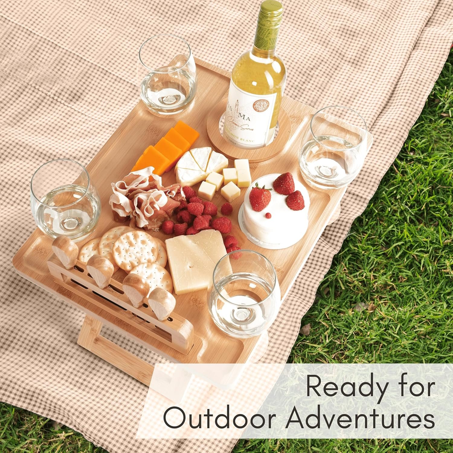 Spacious, Folding & Functional Design: Holds a wine bottle and four glasses with room for fruit, cheese and snacks; folds flat for effortless portability.