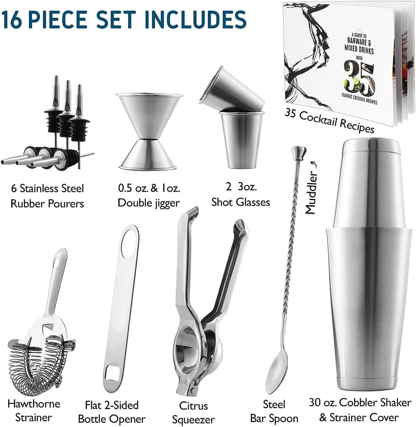 Complete Cocktail Set: Cocktail mixer set includes: 2-piece Boston cocktail shaker, 30 oz; double sided jigger, mixing spoon, Hawthorne strainer, 6 liquor pourers, 7″ flat bottle opener, citrus juicer, 2 stainless steel 3 oz shot glasses, and recipe booklet.