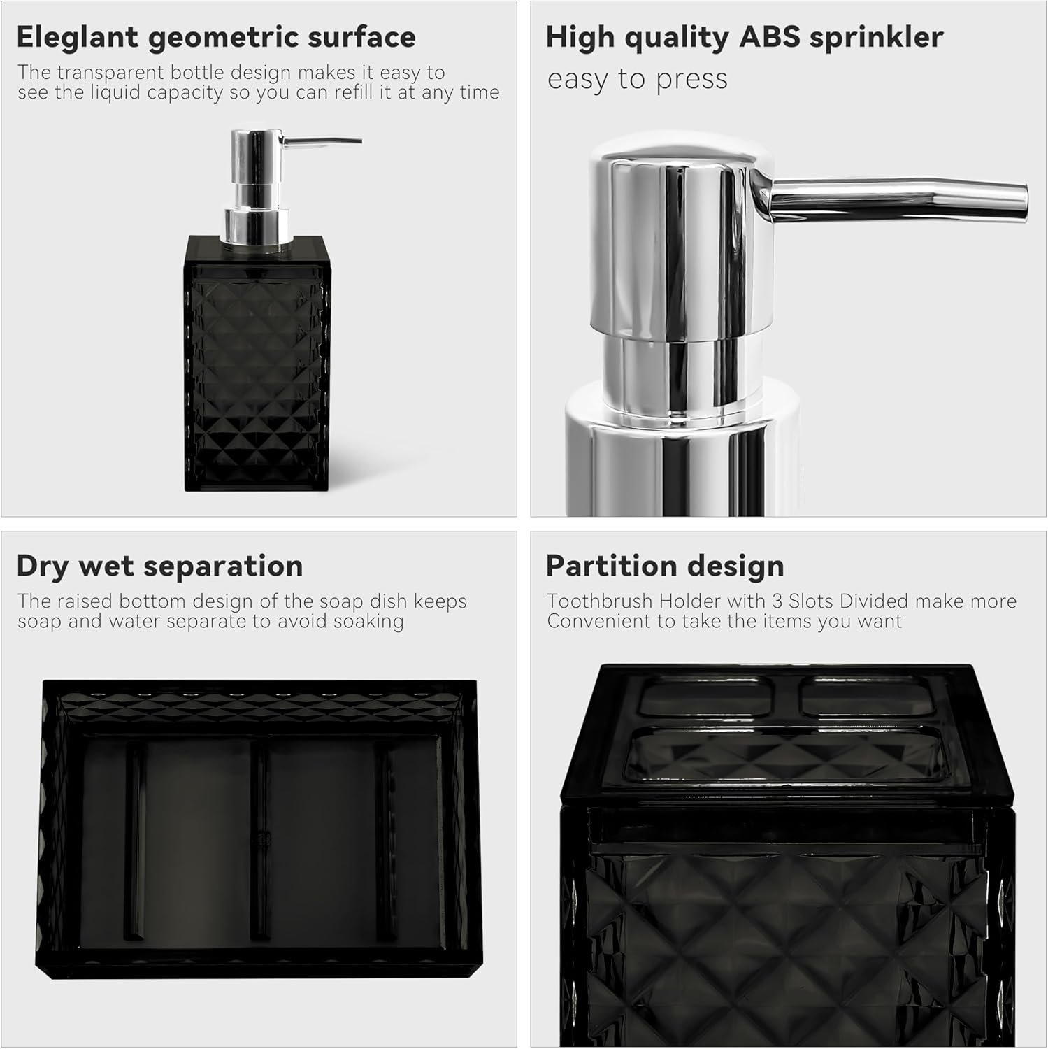 This simple and elegant diamond pattern bathroom accessory set is perfectly matched with many types of bathroom decorations, making your bathroom no longer boring, greatly enhance your bathroom decoration, and make the bathroom supplies clean and tidy.