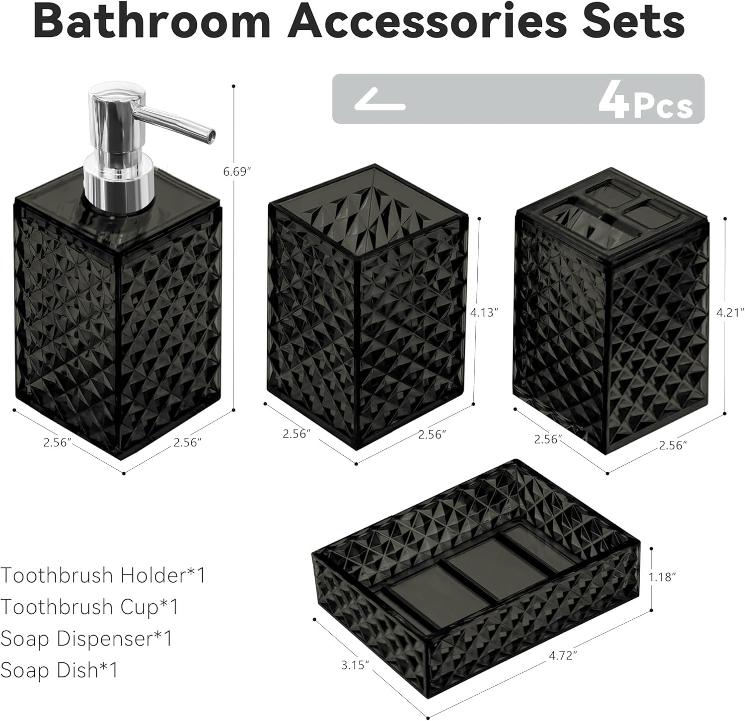 4 PCS Bathroom Accessory Set: Includes 1 x soap dispenser, 1 x toothbrush holder, 1 x soap dish and 1 x mouthwash cup. Our modern bathroom accessories set keeps the bathroom organized and has a minimalist design that perfectly complements your bathroom decoration