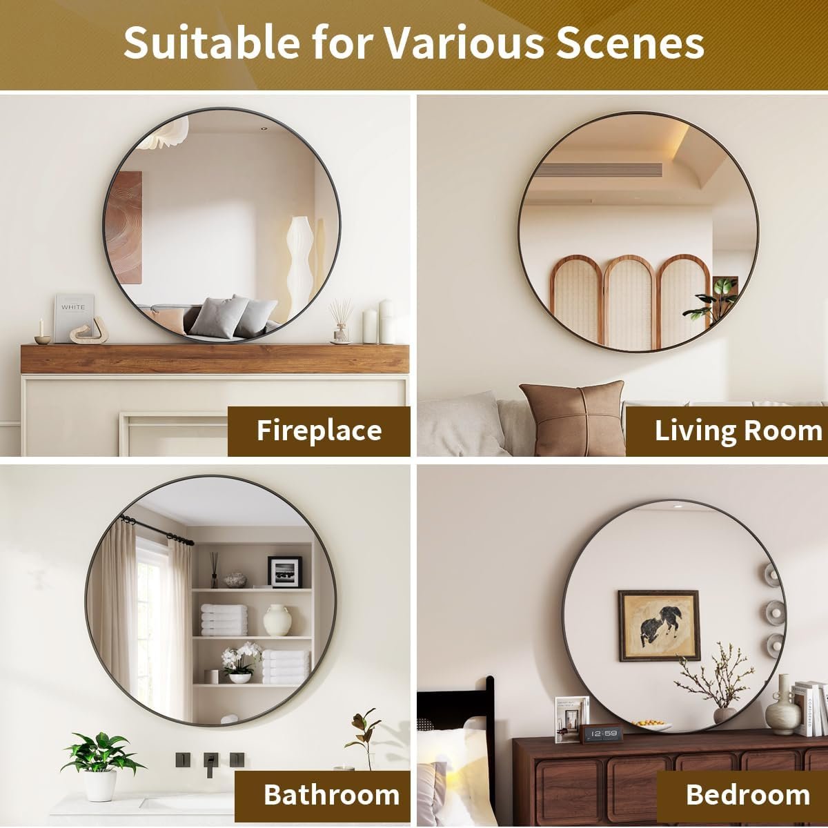 Easy To Install Widely Applicable – There are hooks design on the back of the round mirror, allowing you to easily hang it on the wall. If you don’t want to drill holes on the wall, it is also a good choice to put it on the fireplace or cabinet. Whether it’s modern, retro, luxurious, farmhouse or minimalist, it can match