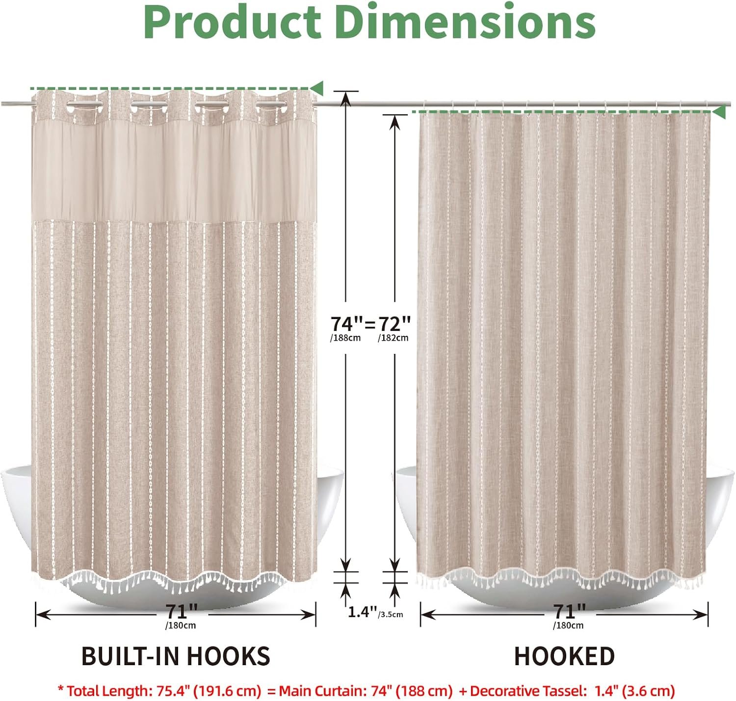 【Dimensions】:W71xH74 inches(The tassel length is not included,same size as 72″Wx72″L hooked shower curtain).The tassel brings 1.4 inches of additional length.Package includes 1 tan/taupe shower curtain and 1 snap-in fabric liner