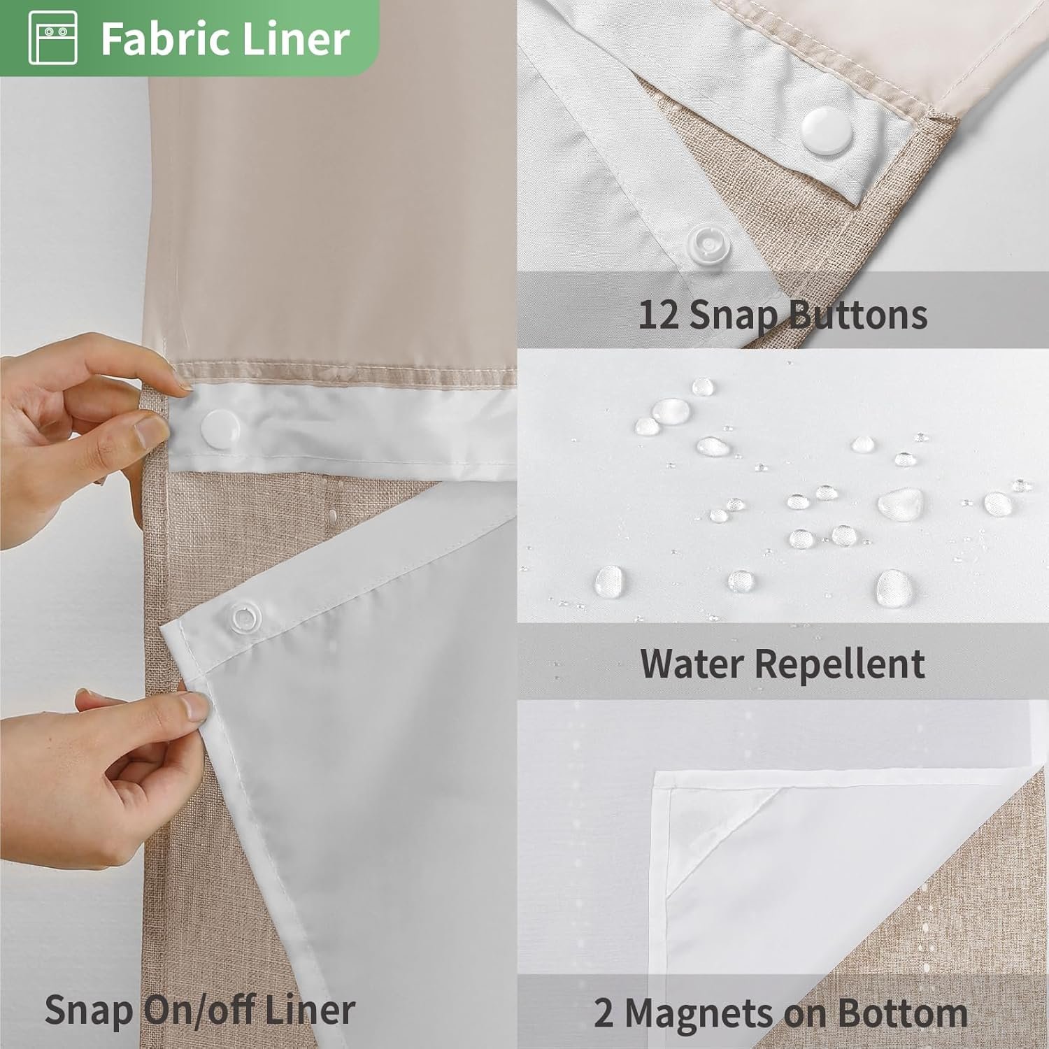 【Shower Curtain with Snap-On Liner】:This snap-on fabric shower curtain liner is easily detachable,making it convenient for cleaning or replacement.Equipped with 2 magnets at the bottom corners for added stability and to prevent splashing