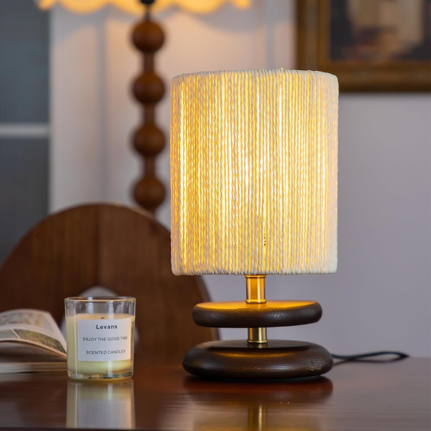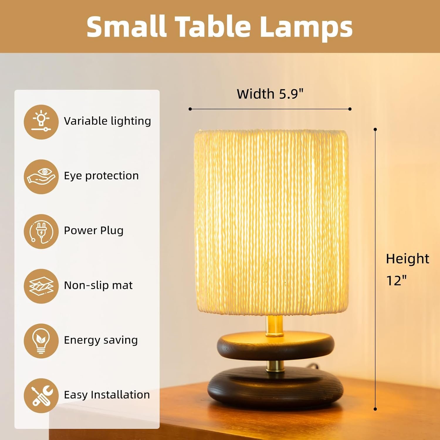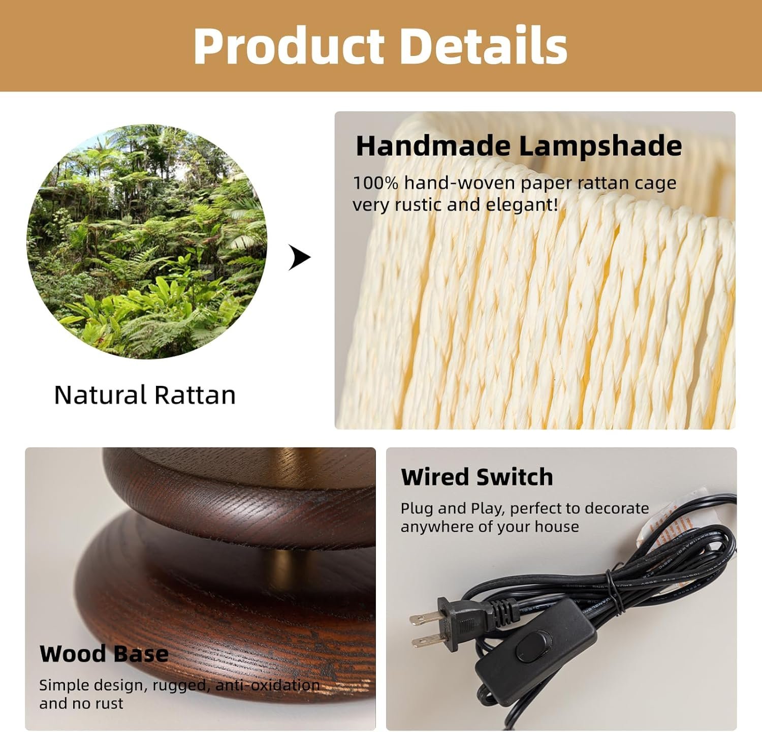 5 reviews for Boho Rattan Table Lamp Rustic Wood Bedside Lamp with Handmade Woven Shade Vintage Natural Decorative Nightstand Lamp for Bedroom Living Room Desk Kids Room, Dia5.9 x H12