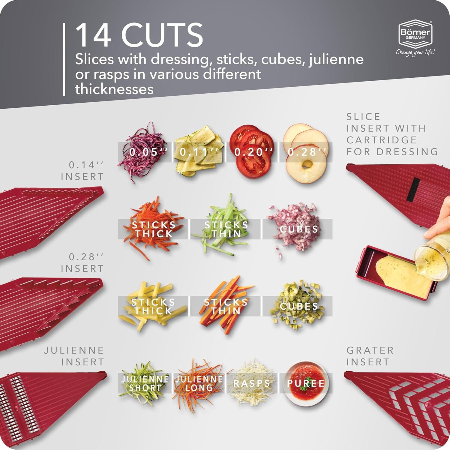 THE VITAL KITCHEN SLICER THAT DOES IT ALL! – The absolute highlight of the Börner Vital V-Slicer Professional Set is the 2 new grater inserts. With the Roko insert, you can cut thin julienne strips, perfect for salads or vegetable zoodles. The grater insert is ideal for grating cheese, potatoes, or chocolate.