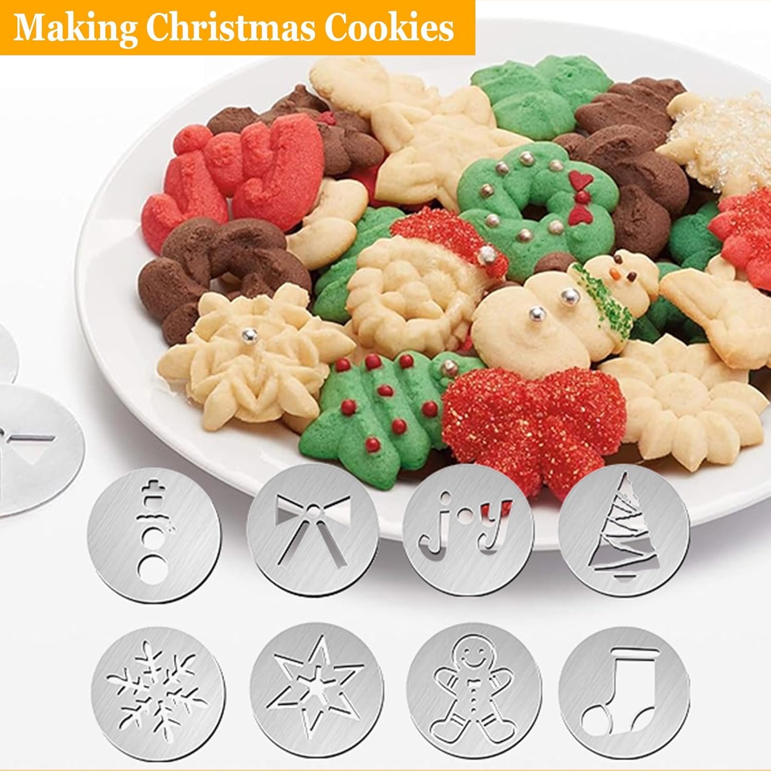 Extra-Large 3-in-1 Baking Set—Includes 8 Christmas-themed cookie discs, 4 churros discs, and 8 decorating tips. The oversized cookie press allows you to make more cookies at once. Features a thickened food-grade plastic barrel for long-lasting durability.