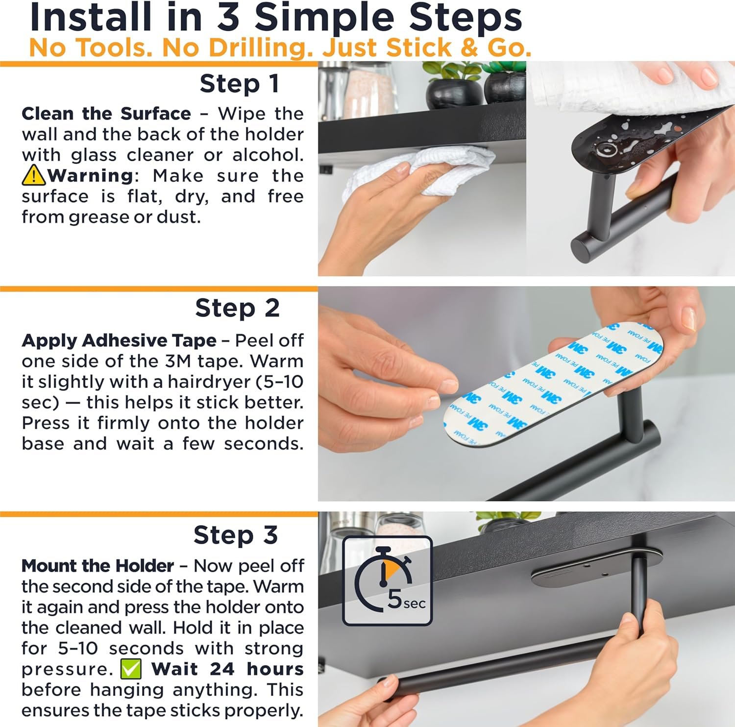 ✅ 【Stick or Screw – Installs on Any Surface】: Designed for both smooth and rough surfaces, this self adhesive paper towel holder can be mounted with industrial-strength adhesive (perfect for tile, glass, wood, or metal) or screwed in for added stability on textured walls. Just peel, press for 20 seconds, and let it set for 24 hours.