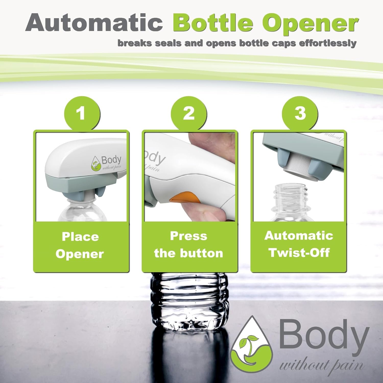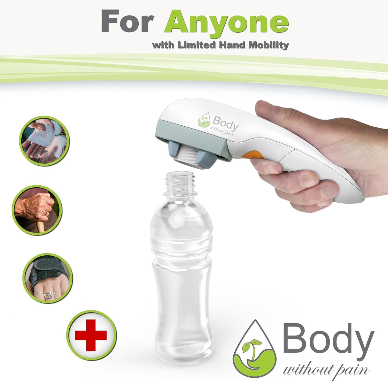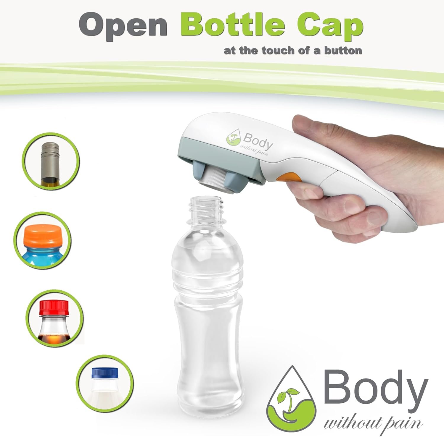 Simply push a button to easily open plastic and glass bottles, perfect for those with arthritis or weak hands.