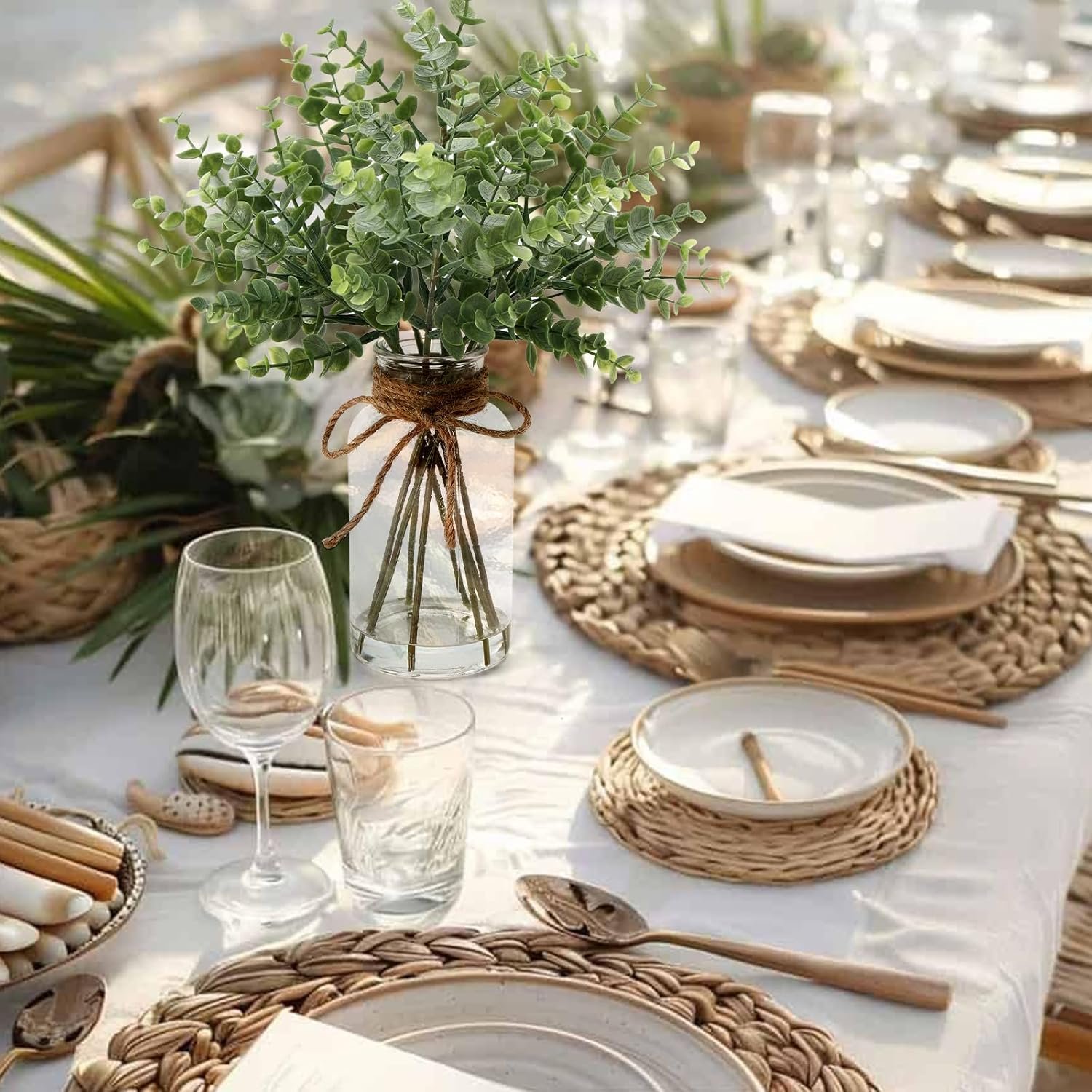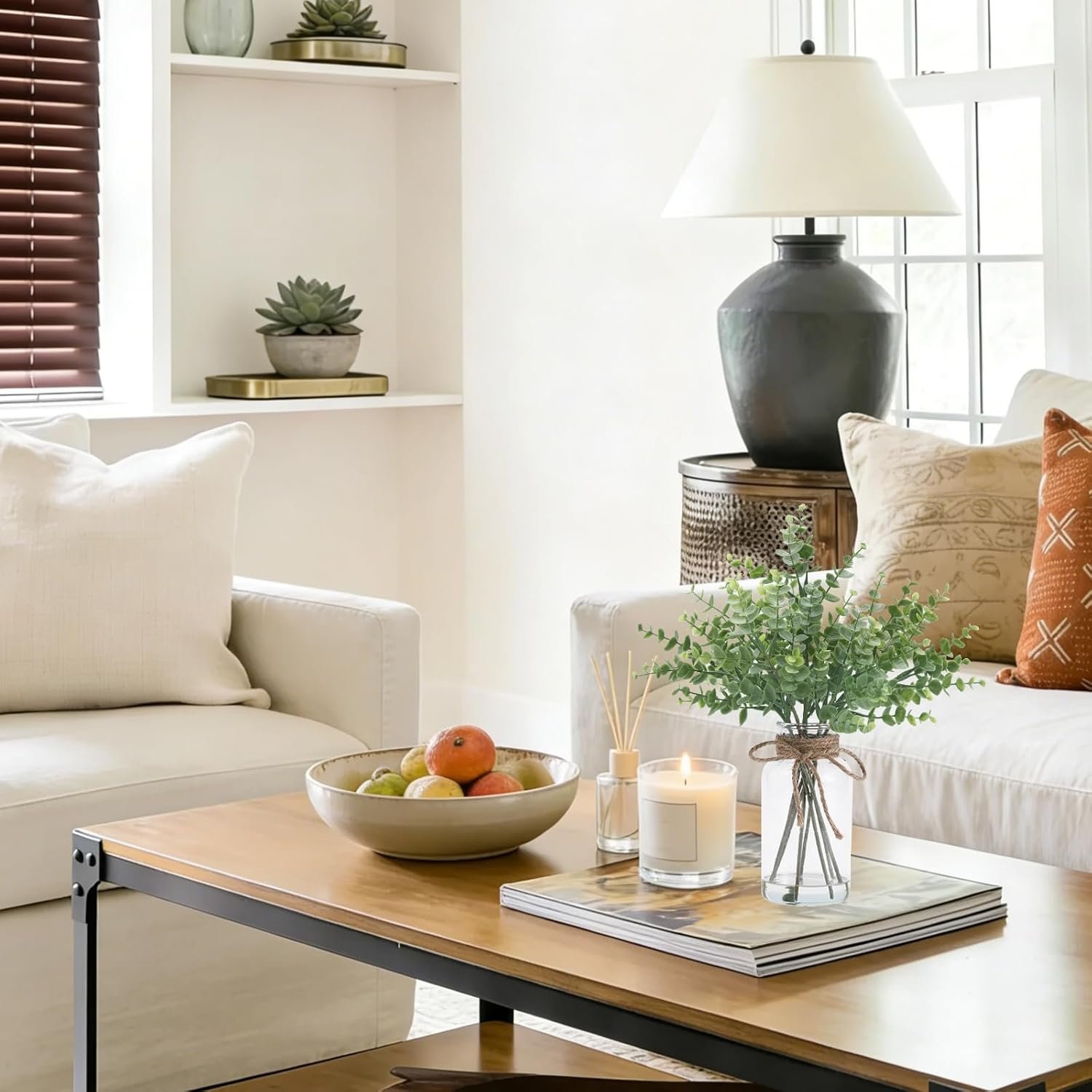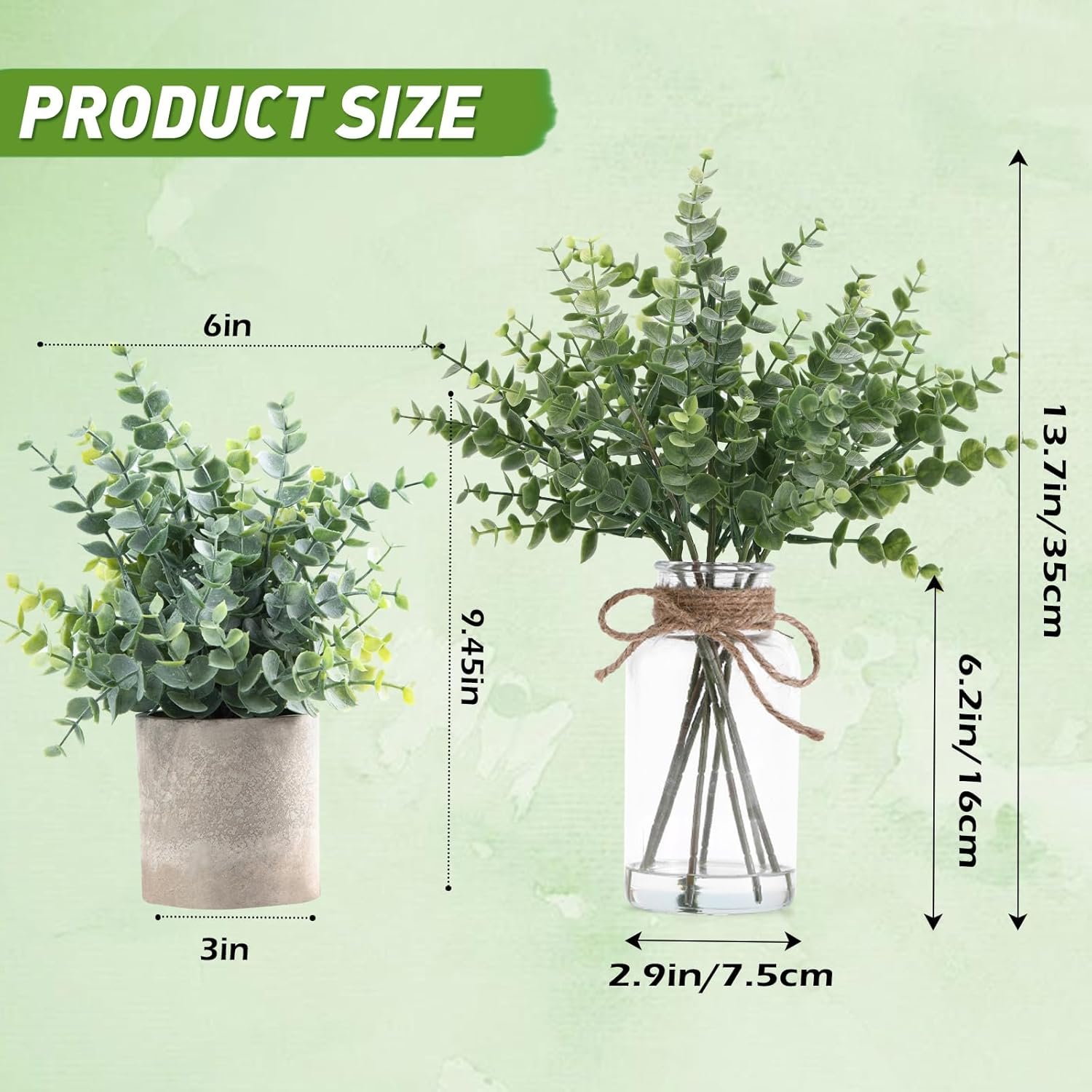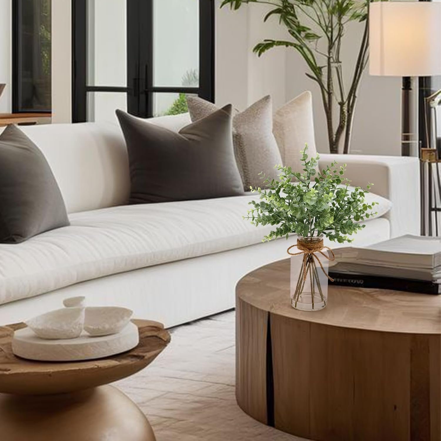 【Small Fake Plants in Vase】Our eucalyptus artificial plants are meticulously crafted to replicate the true form of real branches, featuring sage green color, natural textures, and a lifelike feel. Each set includes 8 stems inserted into a glass vase filled with faux water, standing at a height of 14 inches and a width of 10 inches.