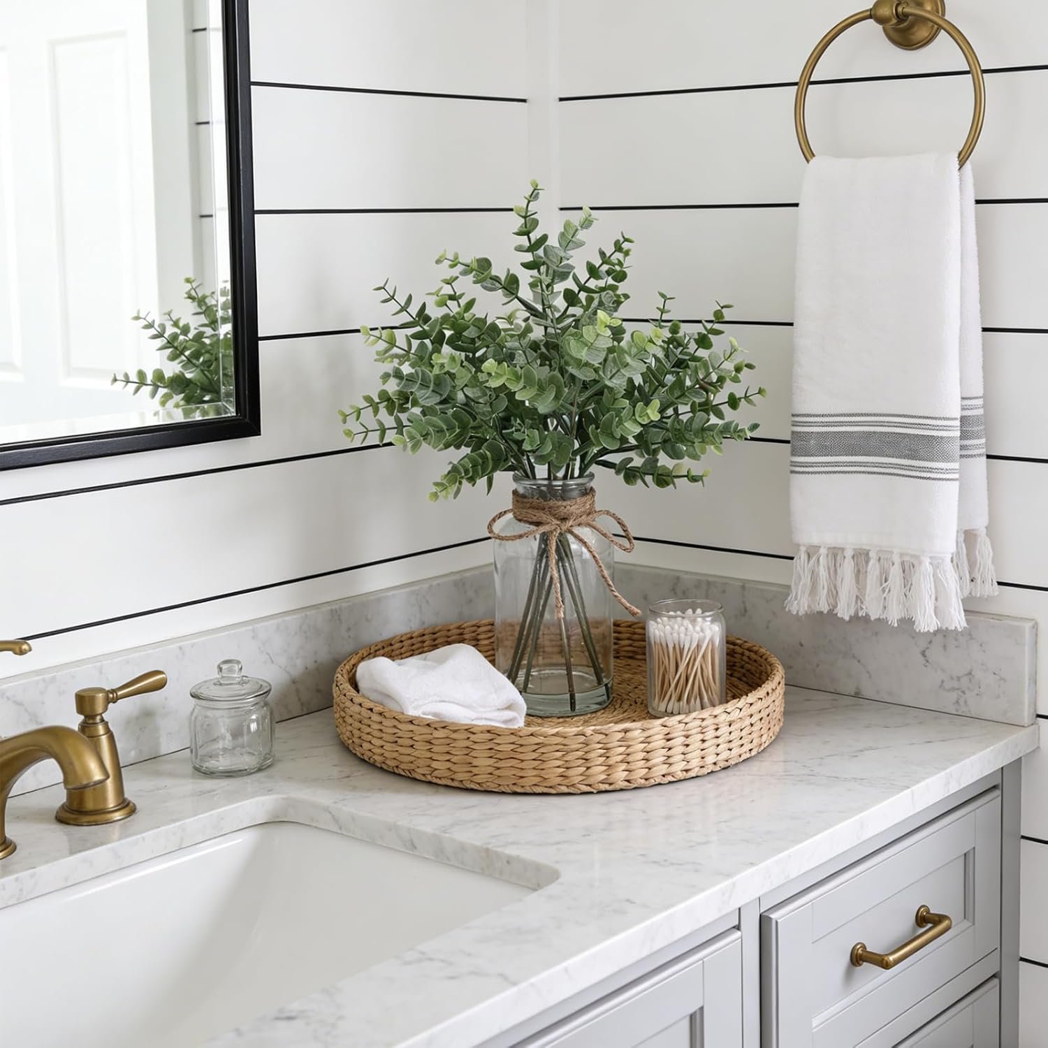 【High-Quality Material】Made from high-quality plastic, our eucalyptus sage green bathroom decor won’t fade or become brittle even when exposed to wind, sun, or rain,remaining beautiful and intact for years to come.