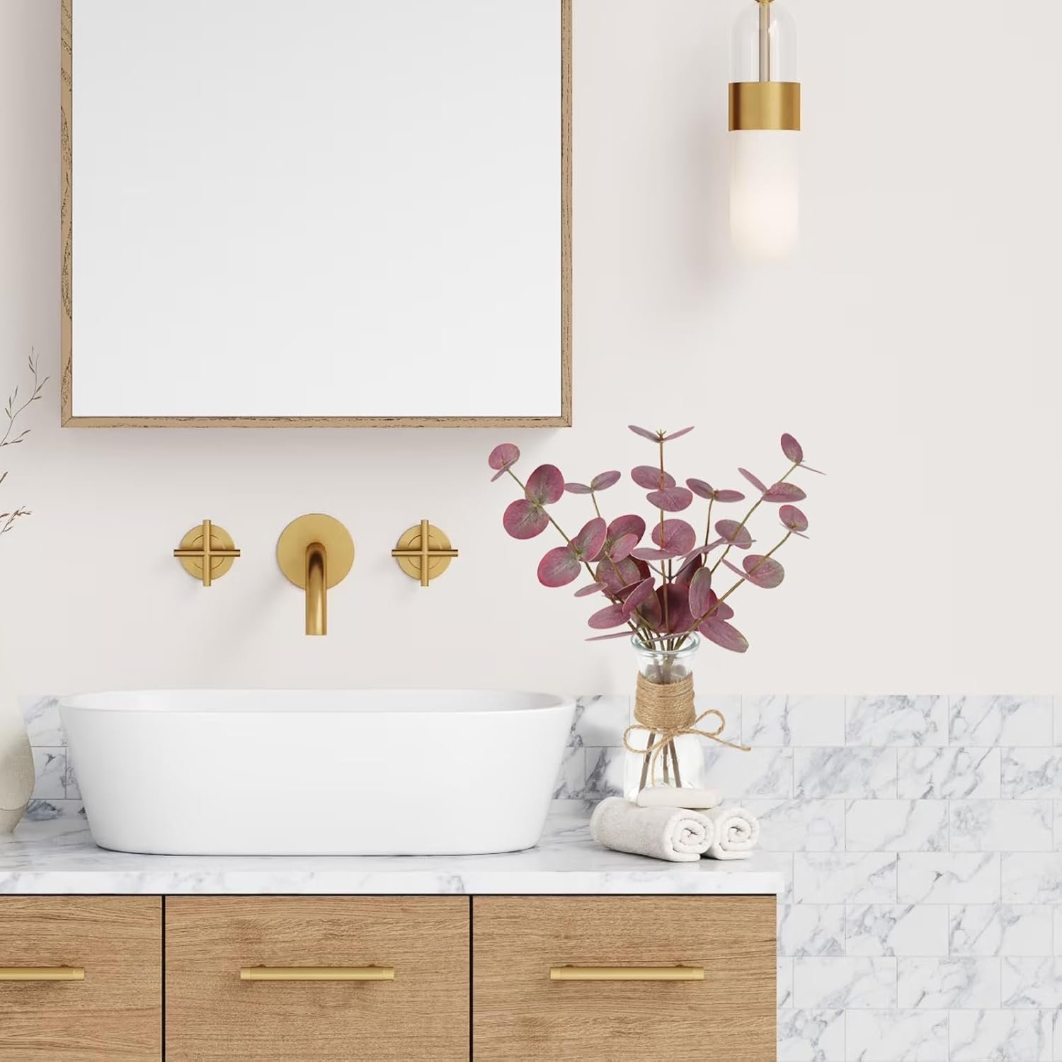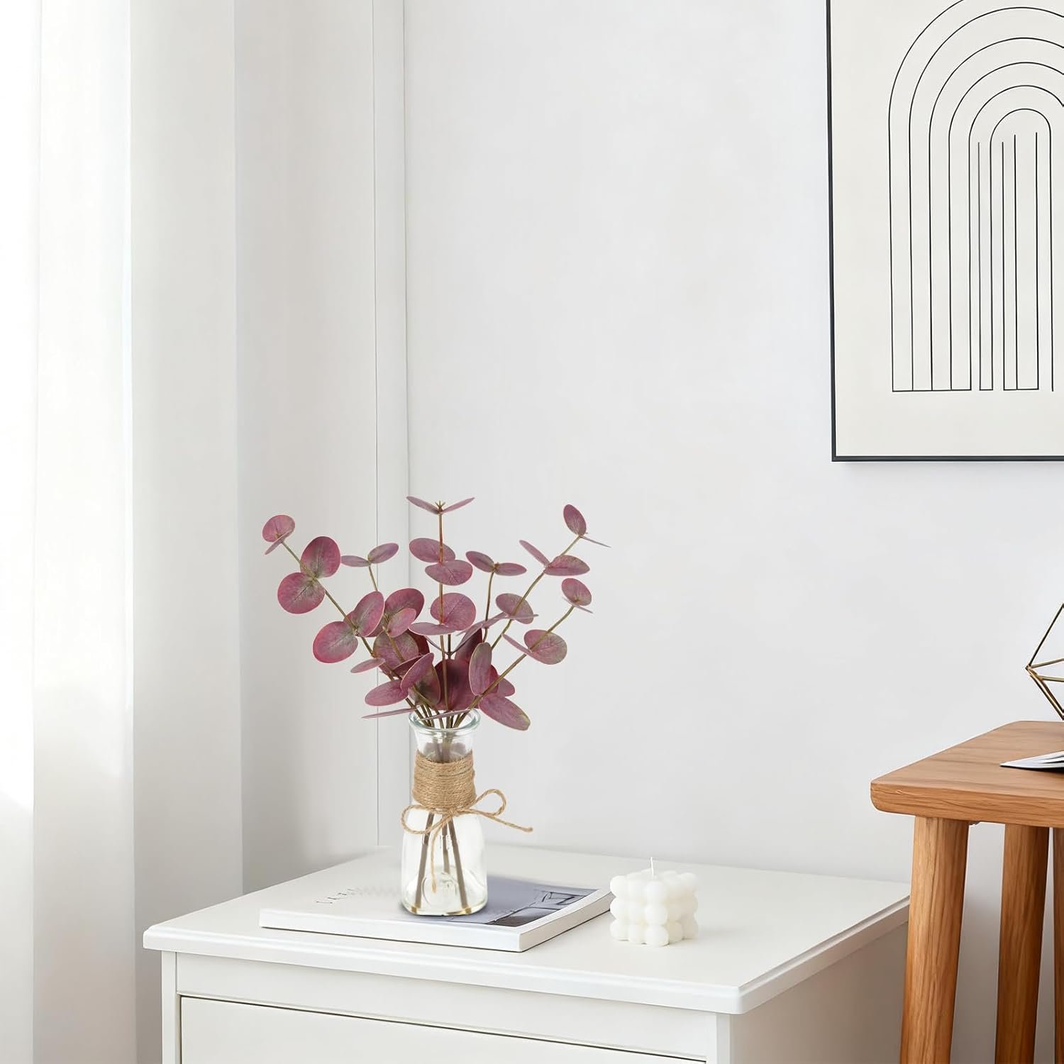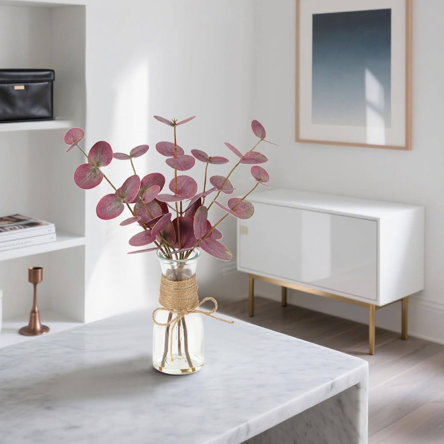 Durable: The faux eucalyptus stems are placed in a glass vase with real artificial water, which can fix the eucalyptus stem very well, providing a stable and natural appearance, and easily enhancing the elegance of your home. Even after a long period of time, the eucalyptus leaves will not fade and retain their original brightness and vitality