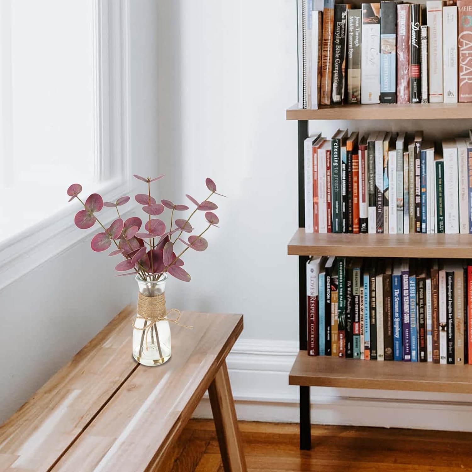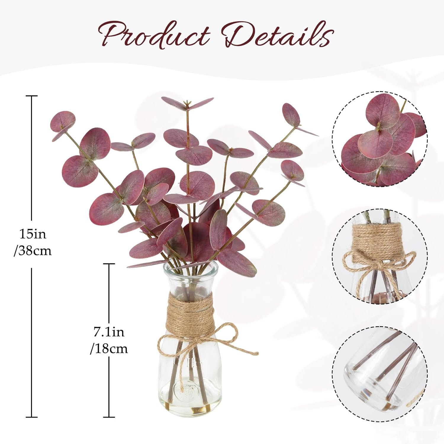 Ideal Size: Each package includes 3pcs artificial eucalyptus stems, each approximately 15inches/38cm in length, paired with a 7.1inches/18cm transparent glass vase, making it suitable for any small corner of your home, whether by the fireplace, on the bookshelf, or beside the windowsill, faux plants indoor can add a touch of nature to these places