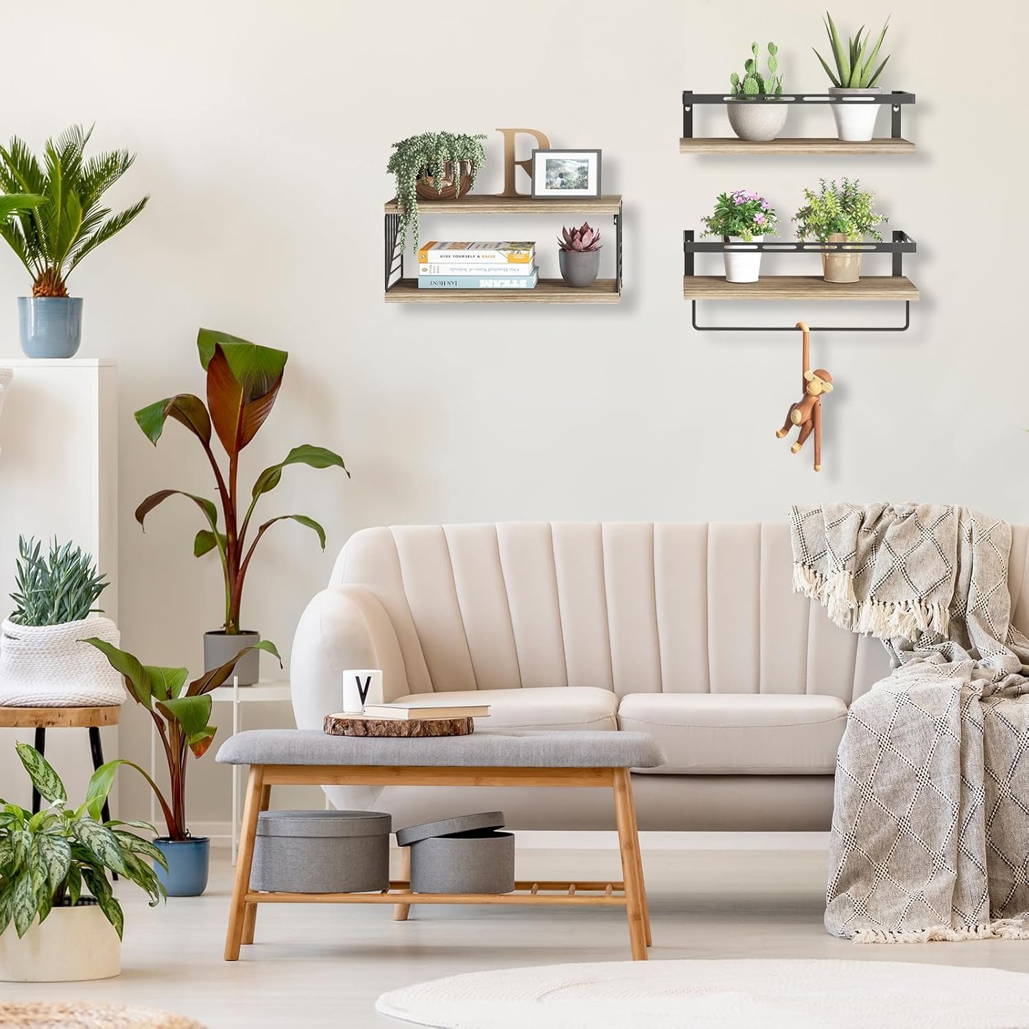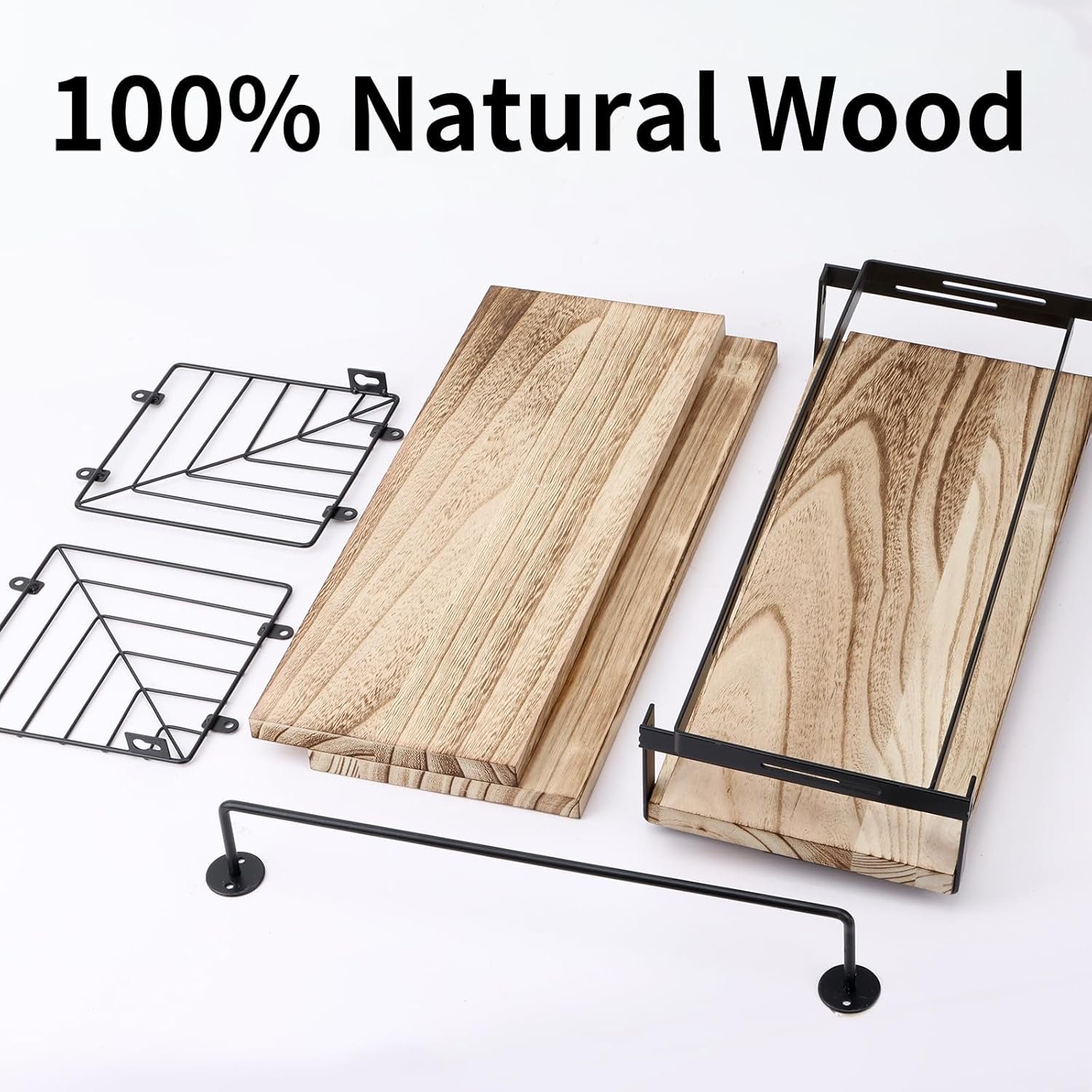 [100% Natural Wood]-These floating shelves are made of paulownia wood, ensuring both stability and durability. The wood boards undergo a meticulous carbonization and fumigation process, resulting in a retro-style appearance. They are then coated with varnish to protect against moisture. The treatment process is harmless while providing acid resistance, heat resistance, and easy cleaning. Rustic wood shows the farmhouse style, bringing nature home.
