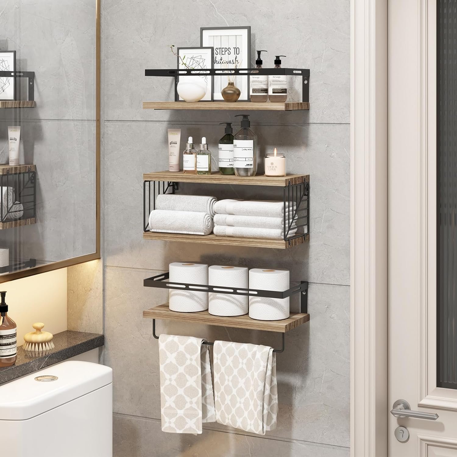 Fixwal Bathroom Shelves Over Toilet, Floating Shelves Wall Mounted with Metal Frame and Towel Bar for Bathroom, Kitchen, Bedroom, Living Room (3 Plus 1 Rustic Brown)