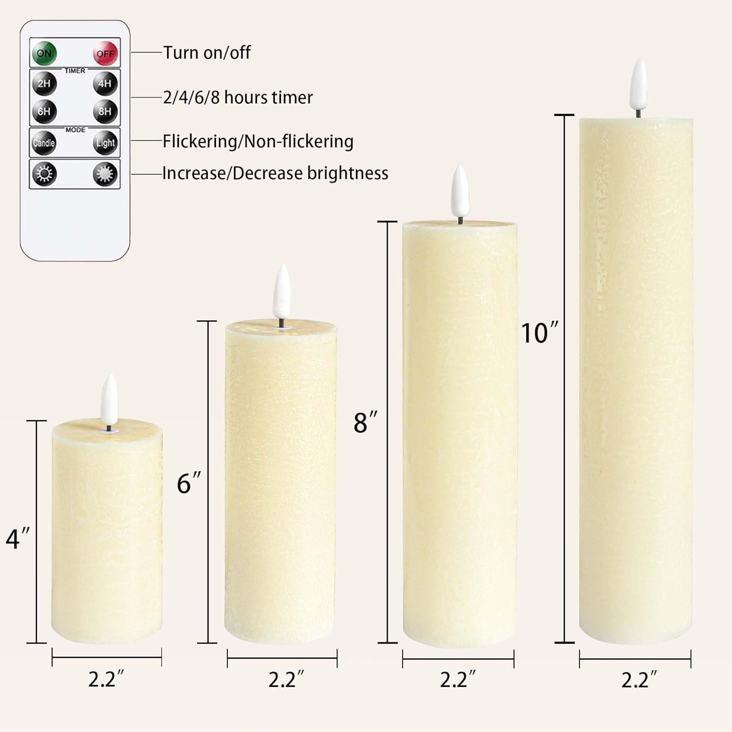 2.2″X4″,6″,8″,10″ LED Candles: The flameless candles are 2.2 inches in diameter and these four led candles are 4 inches, 6 inches, 8 inches and 10 inches in height. The classic colors and different heights of the battery candles are more suitable for decoration in multiple places such as homes and weddings
