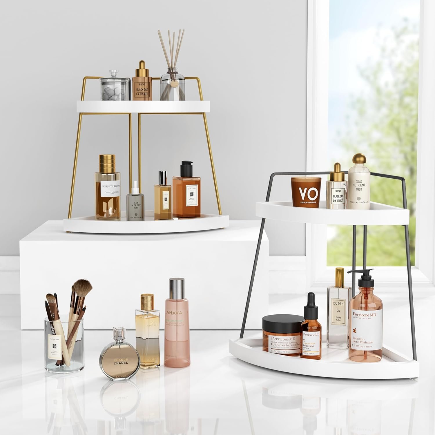 【Versatile Corner Counter Organizer】This 2-tier corner countertop organizer shelf is useful organization tools to declutter counters in your bathroom, makeup room, vanity room, powder room, kitchen, coffee bar, etc. The corner shelf organizer can even be placed in coffee table to organize coffee supplies and accessories.