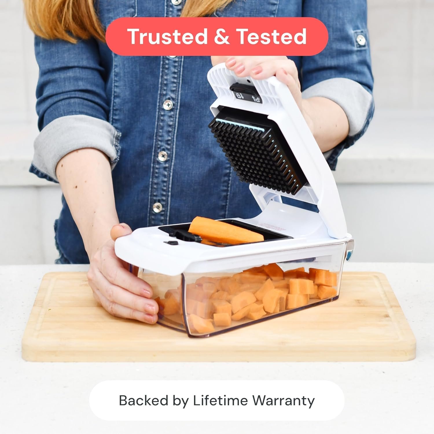 5-Star Design for Everyday Cooking – Built for comfort and precision. The soft-grip TPU handle offers better control, while the non-skid rubber base keeps this BPA-free food chopper stable on any surface. Its built-in catch tray keeps counters clean — making it a perfect house warming gift!