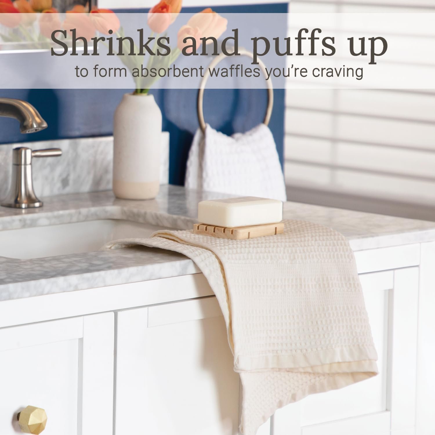 Terry towels often hold onto moisture deep in the loops which causes them to stay damp & get stinky. Waffle towels are different – after washing & shrinking they form waffle squares exposing more surface area that allows them to breathe & stay fresh
