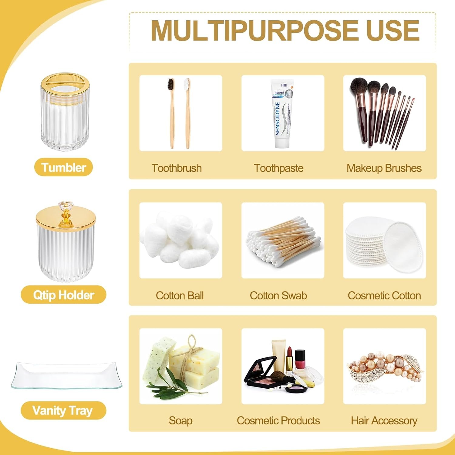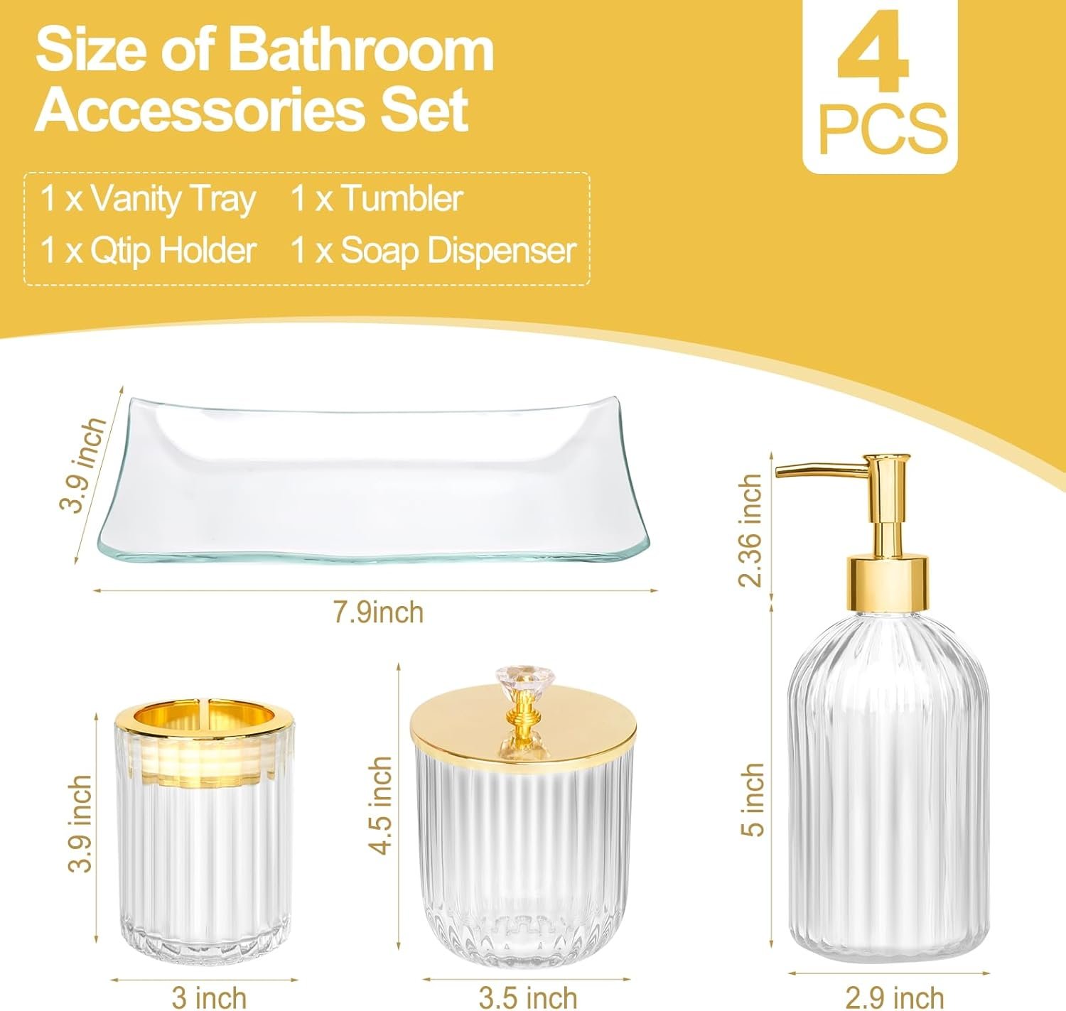 💛 4PCS Clear Bathroom Accessories Sets Complete: This set of bathroom accessories includes a soap dispenser for liquids such as hand sanitizer, a toothbrush holder for toothbrushes and toothpaste, a apothecary jar for cotton swabs or cotton balls, and a vanity tray for hair accessories, tissues, or small skin care products.