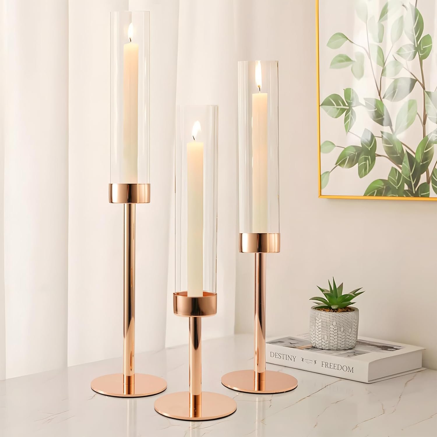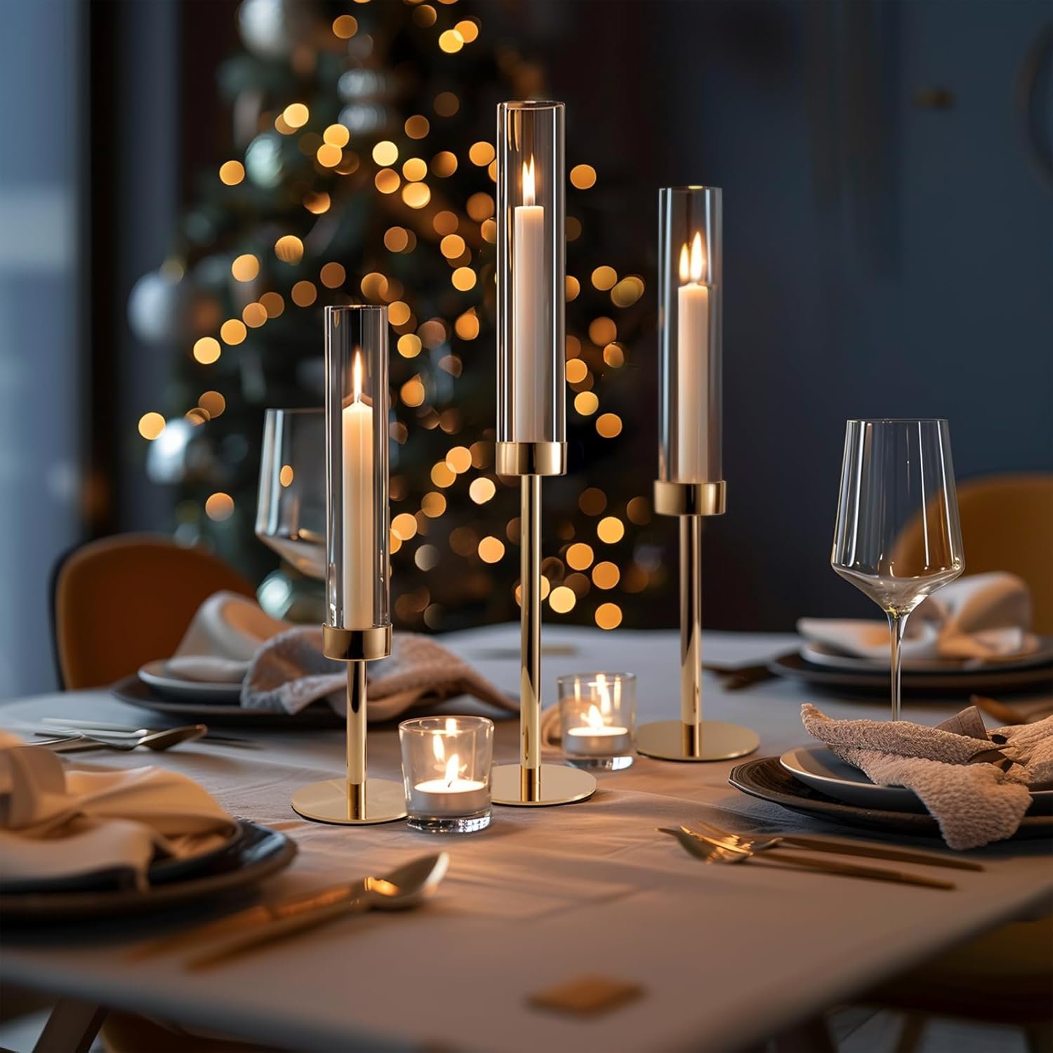 Hurricane Candle Holders: Candlestick holders feature gold metal finish and glass tubes, complementing modern and classic decor styles, ideal for candle stands on dining tables, mantels, and weddings