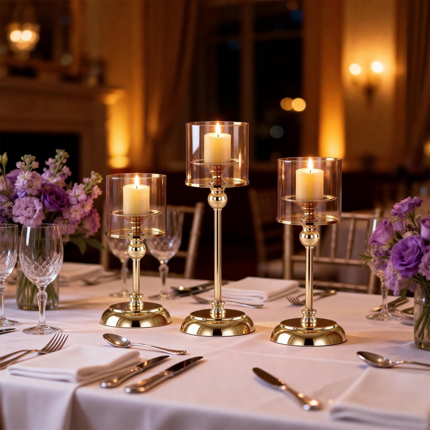 Premium Material & Durable ConstructionOur Gold Hurricane Candle Holders Set of 3 are crafted from high-quality metal (sturdy polished gold finish) and strong clear glass—hand-welded by skilled workers for long-lasting use. Rust-resistant, easy to clean, and the glass won’t break or burst from candle heat. Note: Minor inevitable metal welding points won’t affect the elegant appearance.