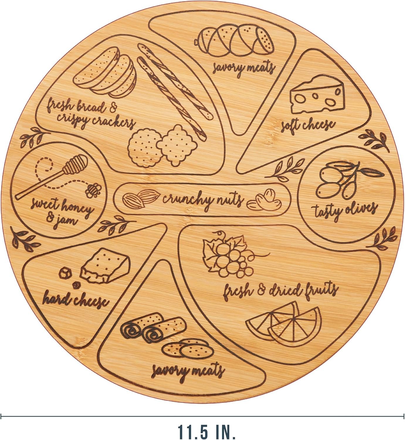 Rotating Bamboo Charcuterie Board: Serve and share with ease using this round charcuterie board, featuring a smooth-spinning bamboo tray that rotates for convenient access to meats, cheeses, fruits, and snacks. Made from natural bamboo for lasting durability and a warm, decorative look. Suitable for indoor or outdoor parties and celebrations throughout the year
