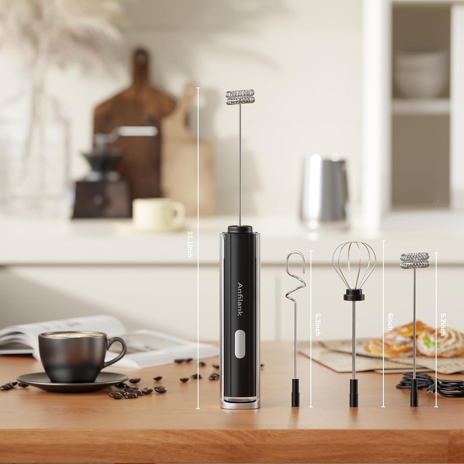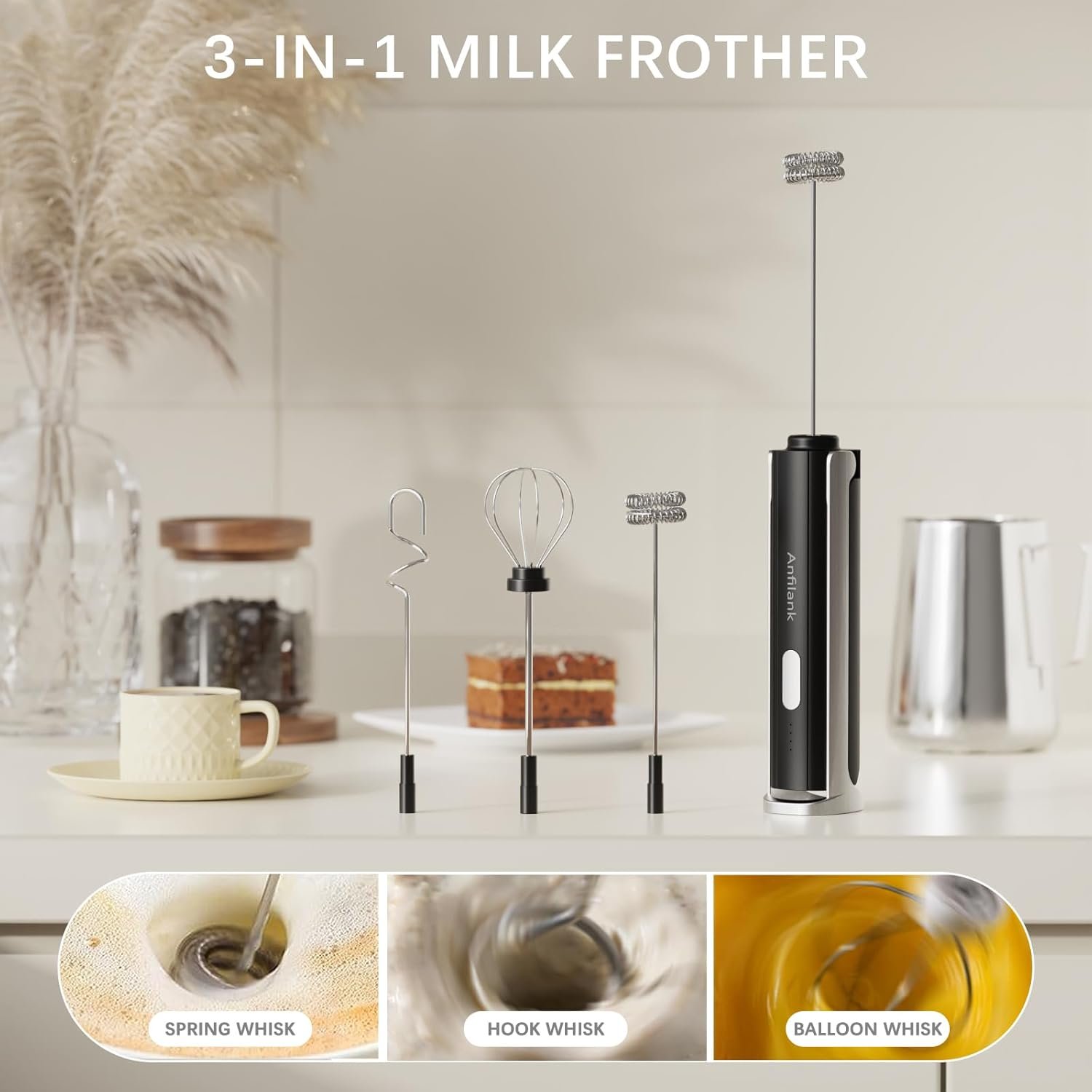 Multi-functional, 3-in-1 Stainless Steel Heads: Comes with 3 stainless steel heads: a spring-loaded head for smooth lattes, a hook-shaped head for mixing protein powder/meal replacements, and a ball-shaped head for whipping eggs/cream. One machine replaces multiple kitchen tools.
