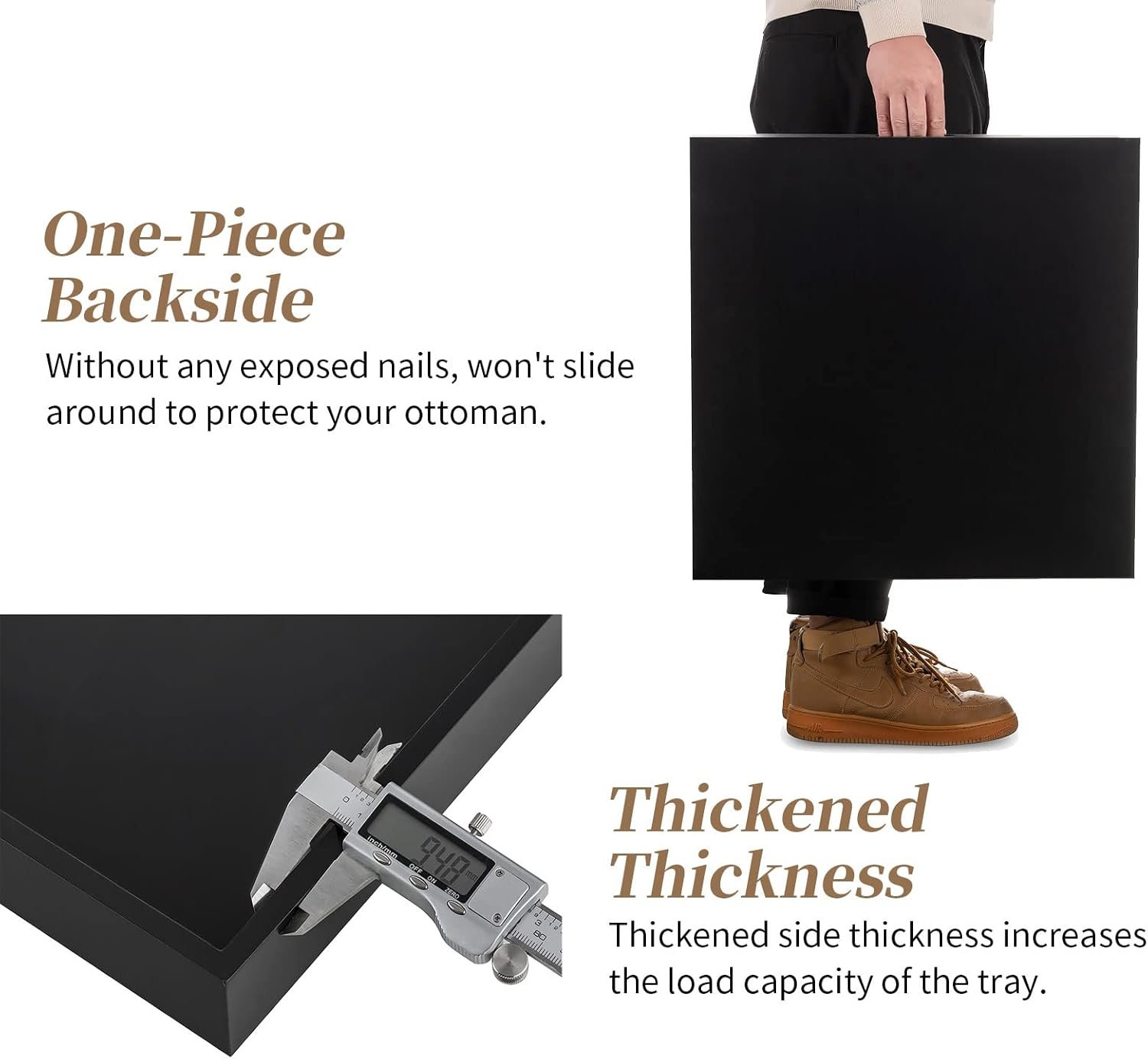 I bought the Hanobe Ottoman Tray (20″) for our new 28-inch ottoman, and it fits absolutely perfectly. I’m really impressed with how sturdy it is — it holds drinks very well, and I never feel like anything is going to tip over or slide off. The all-wood design feels solid and high quality, and the cutout handles on the sides make it easy to pick up and move around when needed.I actually ended up returning another tray I bought at Home Goods because this one was so much better. The look, size, and stability are exactly what I wanted for our living room. Highly recommend!