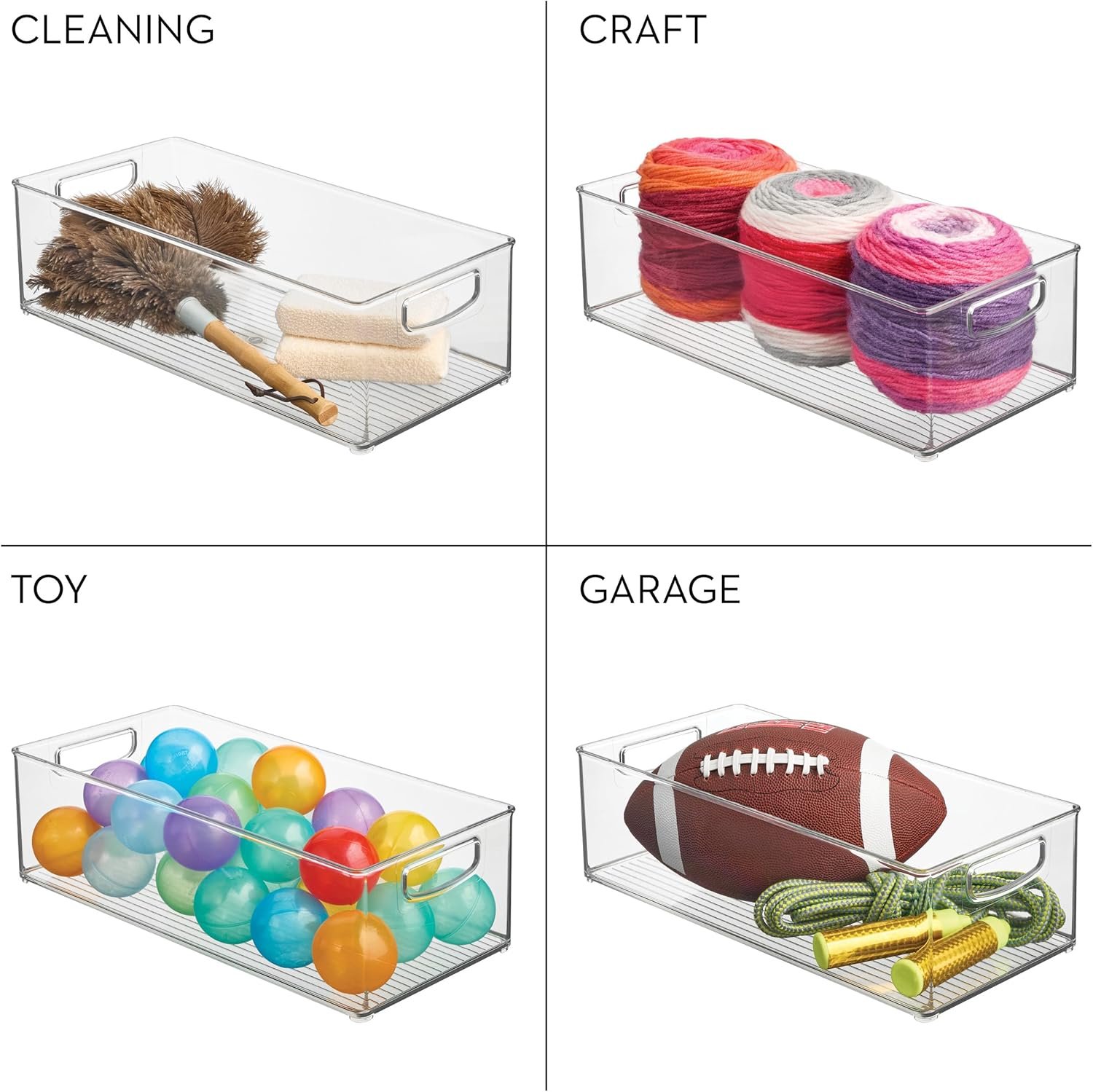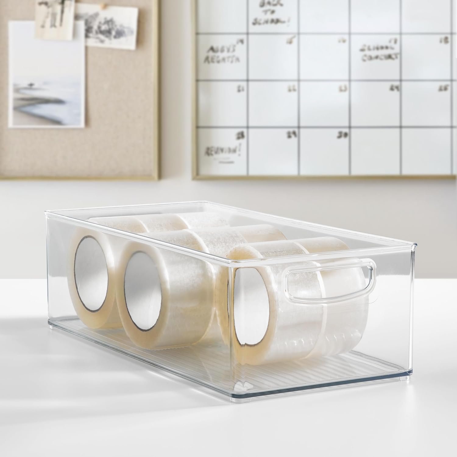 Tackle challenging clutter for good with our iDesign Recycled Plastic Storage Bin with Handles. The clear, open-top design grants immediate reach-in access to everyday essentials, making it easier than ever to find what you’re looking for. Get ready to optimize overlooked and underutilized space with this well-designed solution that stacks securely, utilizing previously wasted storage space. Suitable for daily use, the built-in handles provide an easy grip when sliding off shelves or moving the bin wherever you need. The see-through design allows you to quickly inventory everything inside–from snacks to craft supplies– while ensuring whatever you need is always within arm’s reach. Designed with versatility in mind, this clear plastic storage bin also works in offices, closets, bedrooms, kitchens, pantries, or anywhere else throughout the home that needs organizing. With iDesign, you can live simply every day.