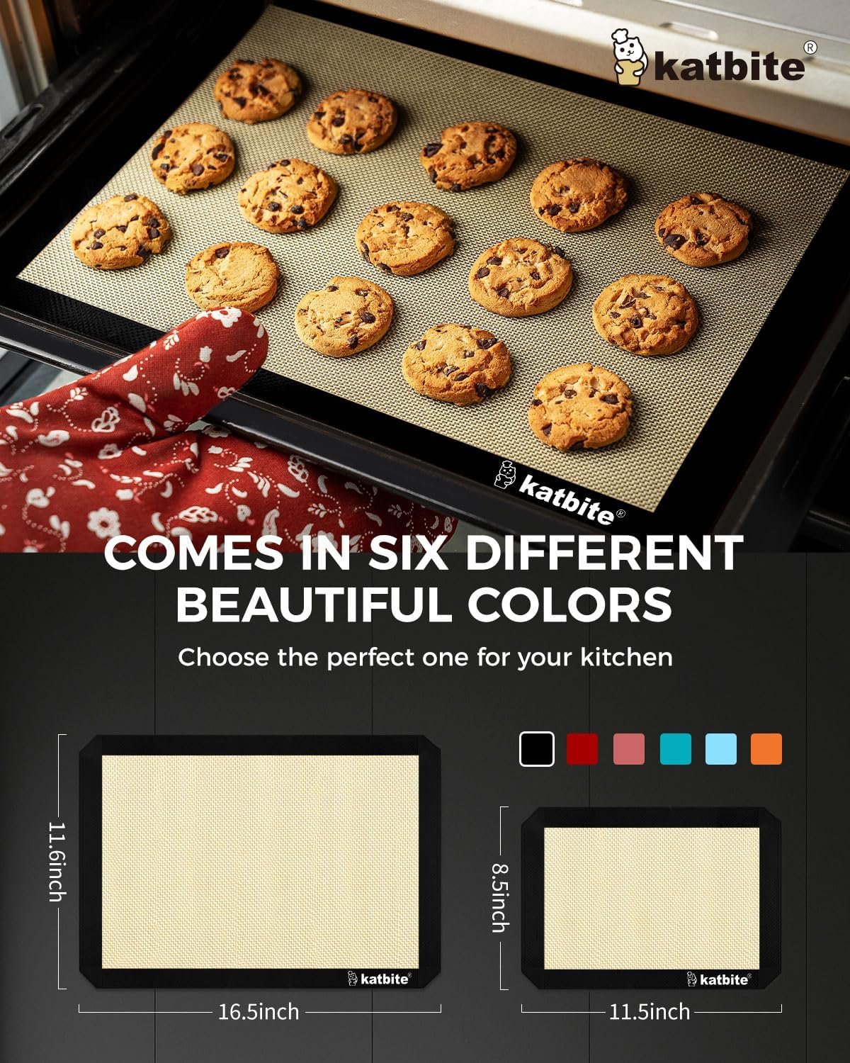 Katbite Silicone Baking Mat Colorful Collection – Set of 3: 2 Half Sheets Mats (11 5/8″ x 16 1/2″) + 1 Quarter Baking Sheet, Reusable & Nonstick Bakeware Mats for Cookies, Macarons, Bread (Black)
