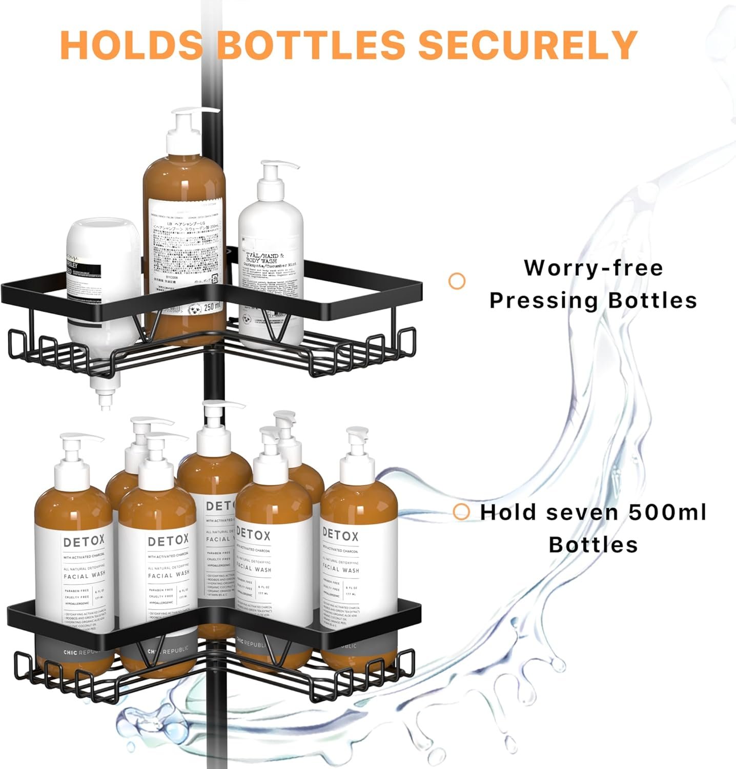 KEGII Corner Shower Caddy Tension Pole – Shower Tension Rod Organizer, Floor to Ceiling Shower Caddy 25-114.2 inch, Towel Rack Corner Waterproof, Black