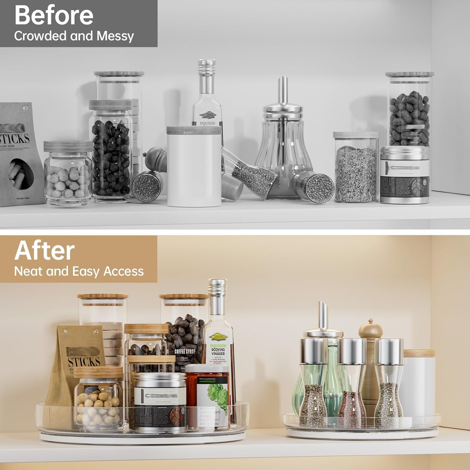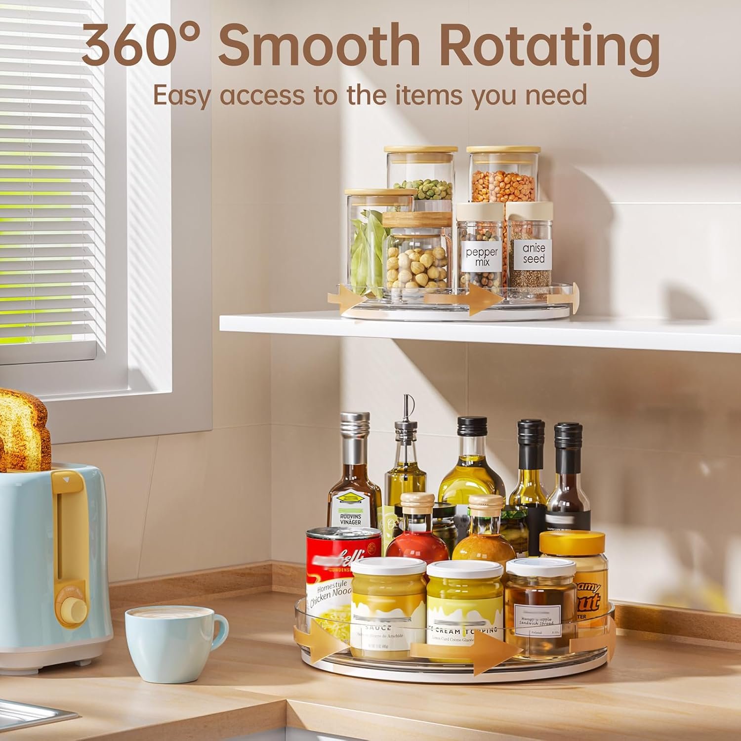 Smooth 360° Rotation for Easy Access: The pantry lazy susan organizer rotates a silky 360 degrees for easy access. With a simple spin, items are within easy reach, making your daily life easier