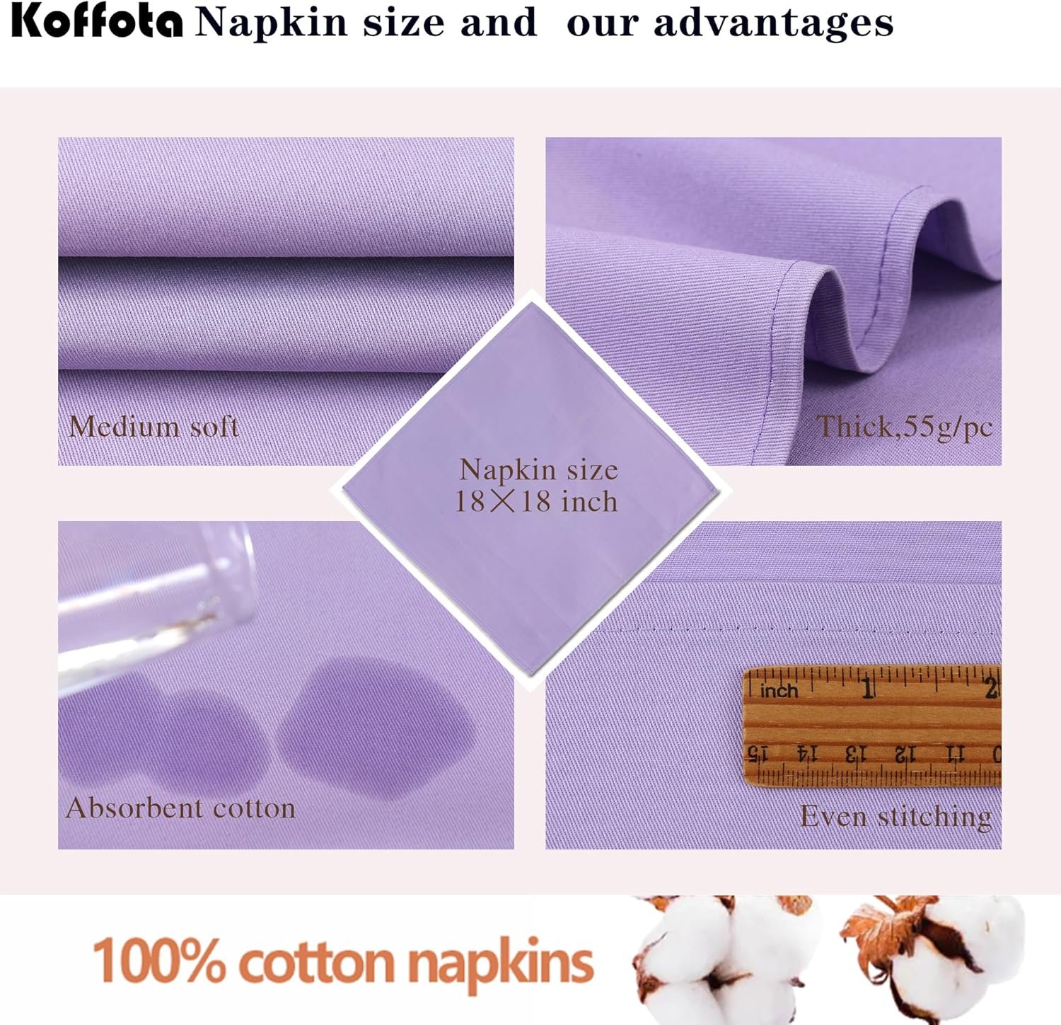 Cotton napkins: each sized18x18 inches; lavender napkins set of 12. Made of 100% raw cotton, these napkin fabrics are high-quality, moderate soft, absorbent, and easy to fold.