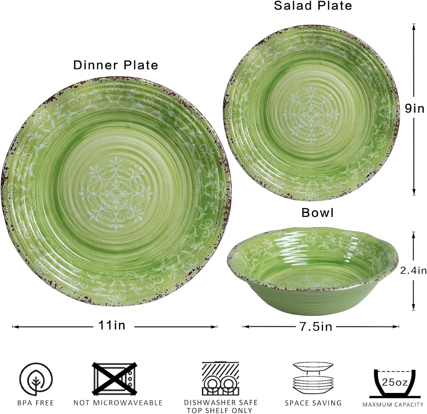 VINTAGE DINNERWARE SET: The melamine dinner set includes 4 pcs 11″dinner plates, 4 pcs 9″ salad plates, and 4 pcs 7.5″ bowls, service for 4