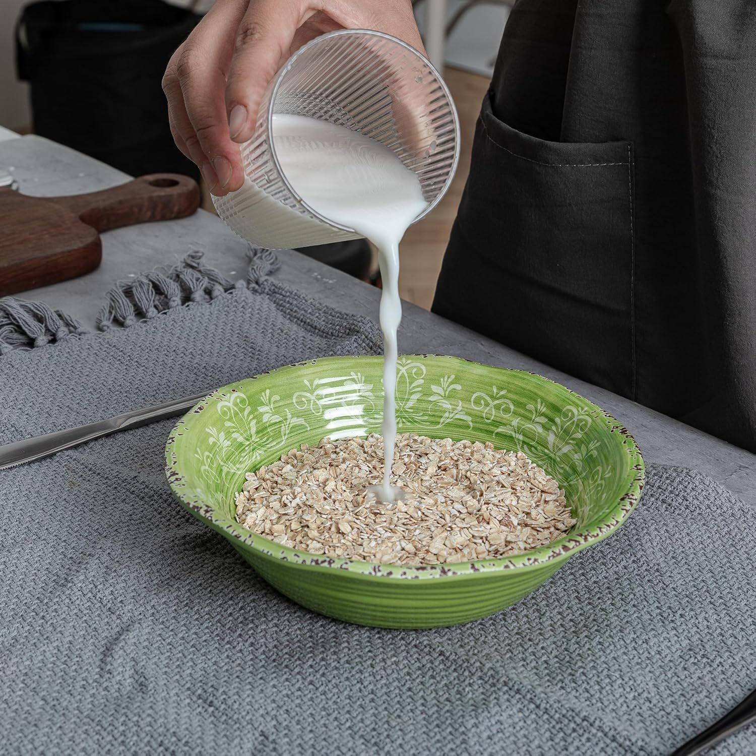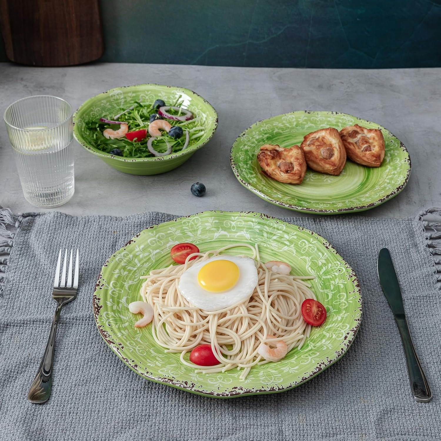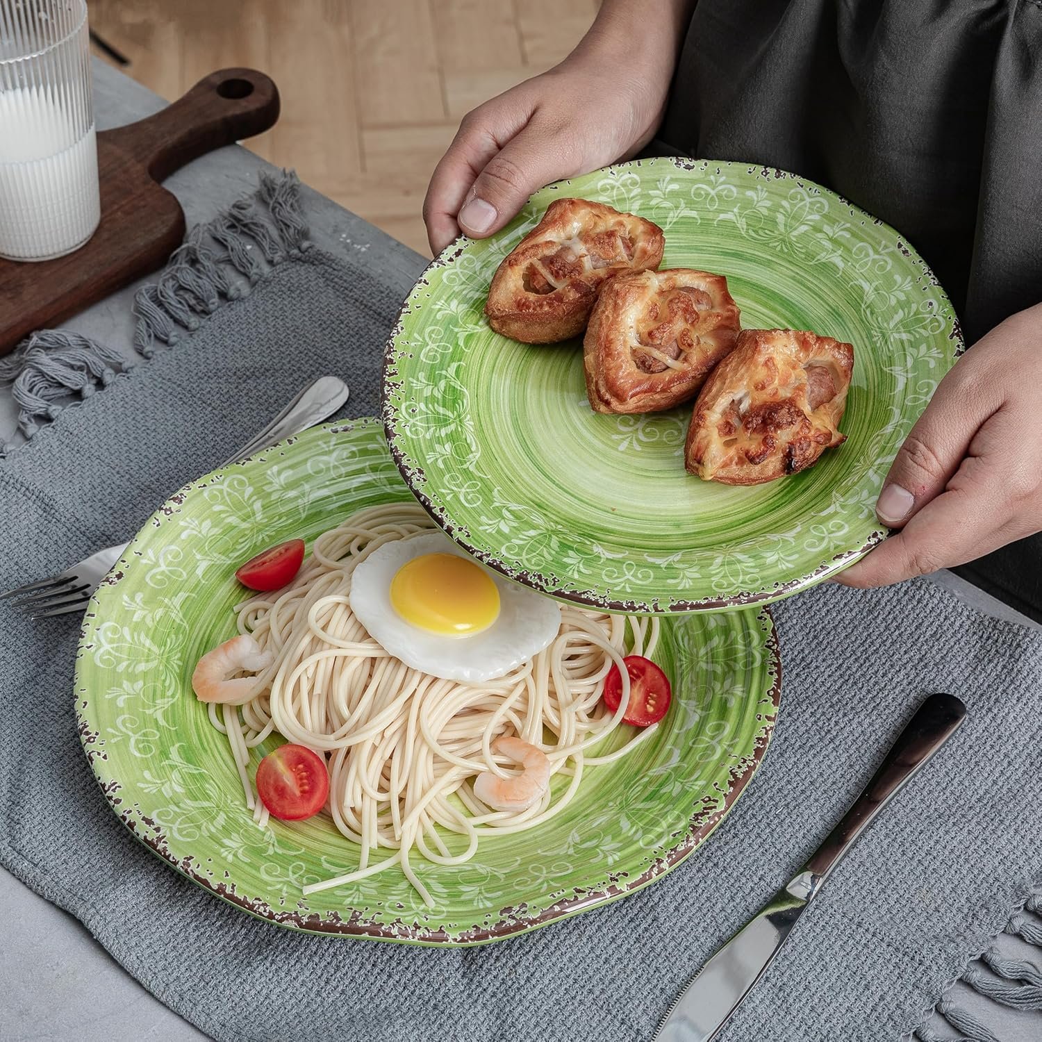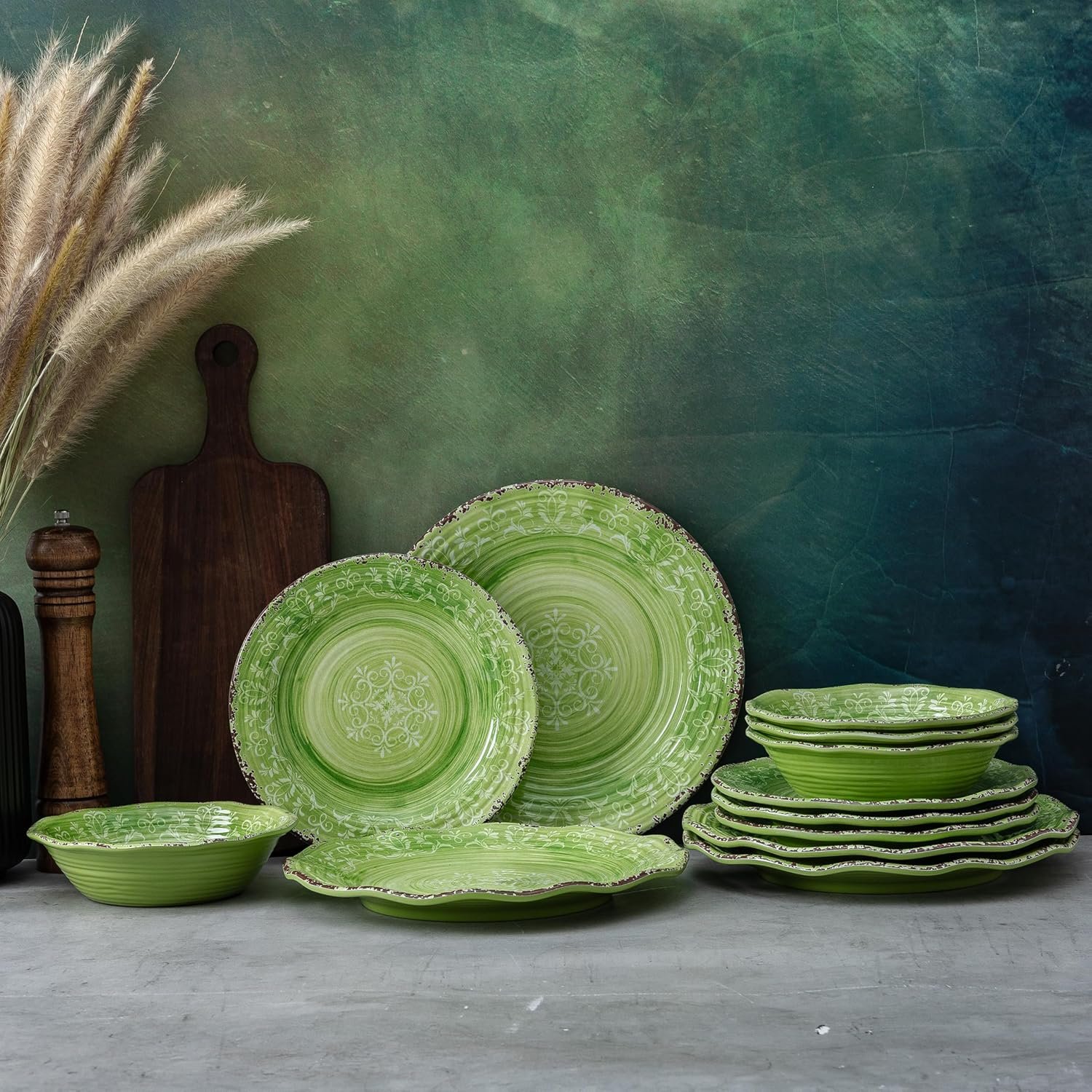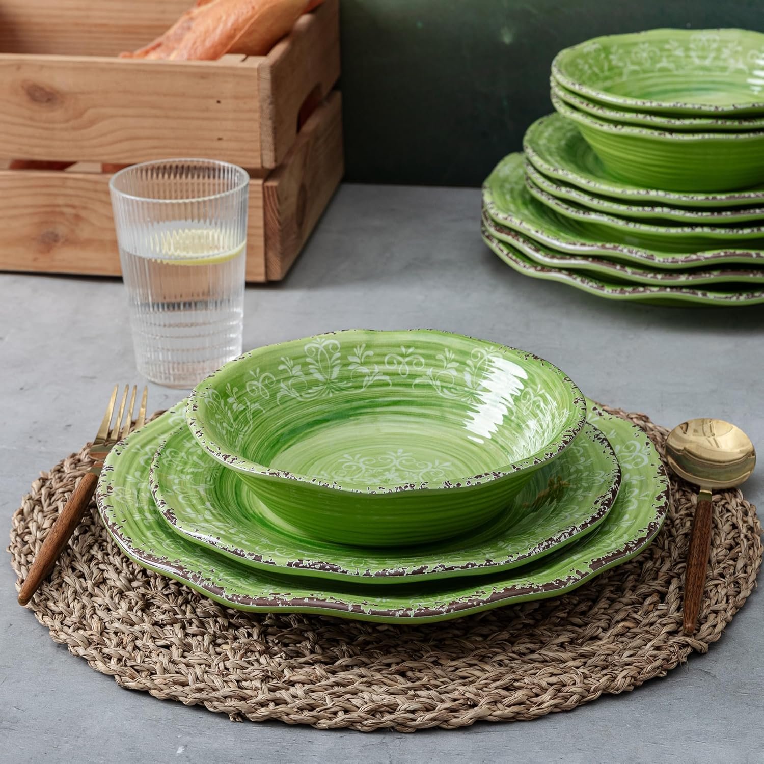 LEHAHA Melamine Dishes Unbreakable Dinnerware Sets, 12 Piece Farmhouse Rustic Swirl Plates and Bowls Set for Outdoor, Picnic, RV, Camping & Everyday Use, Service for 4, Green