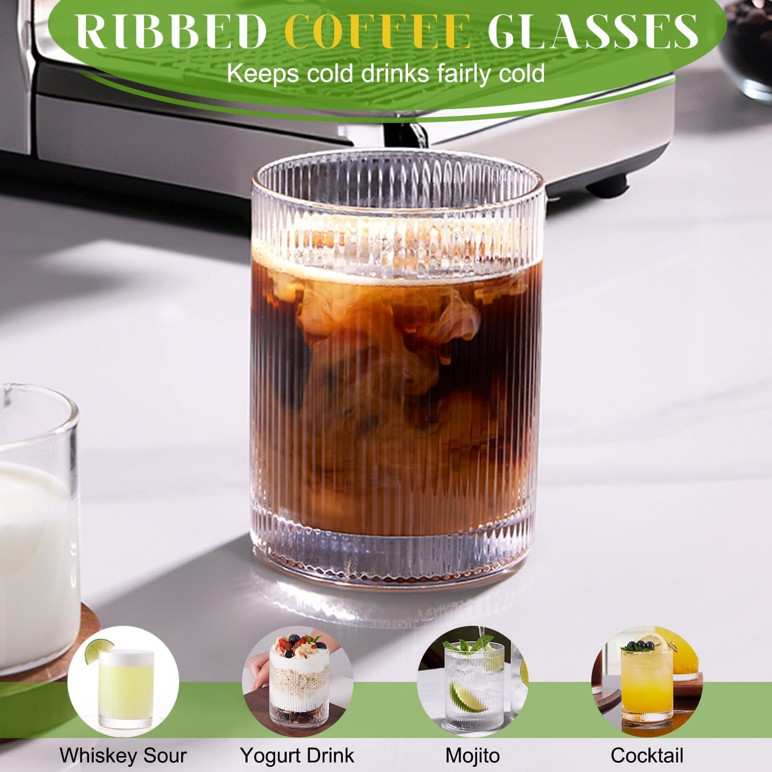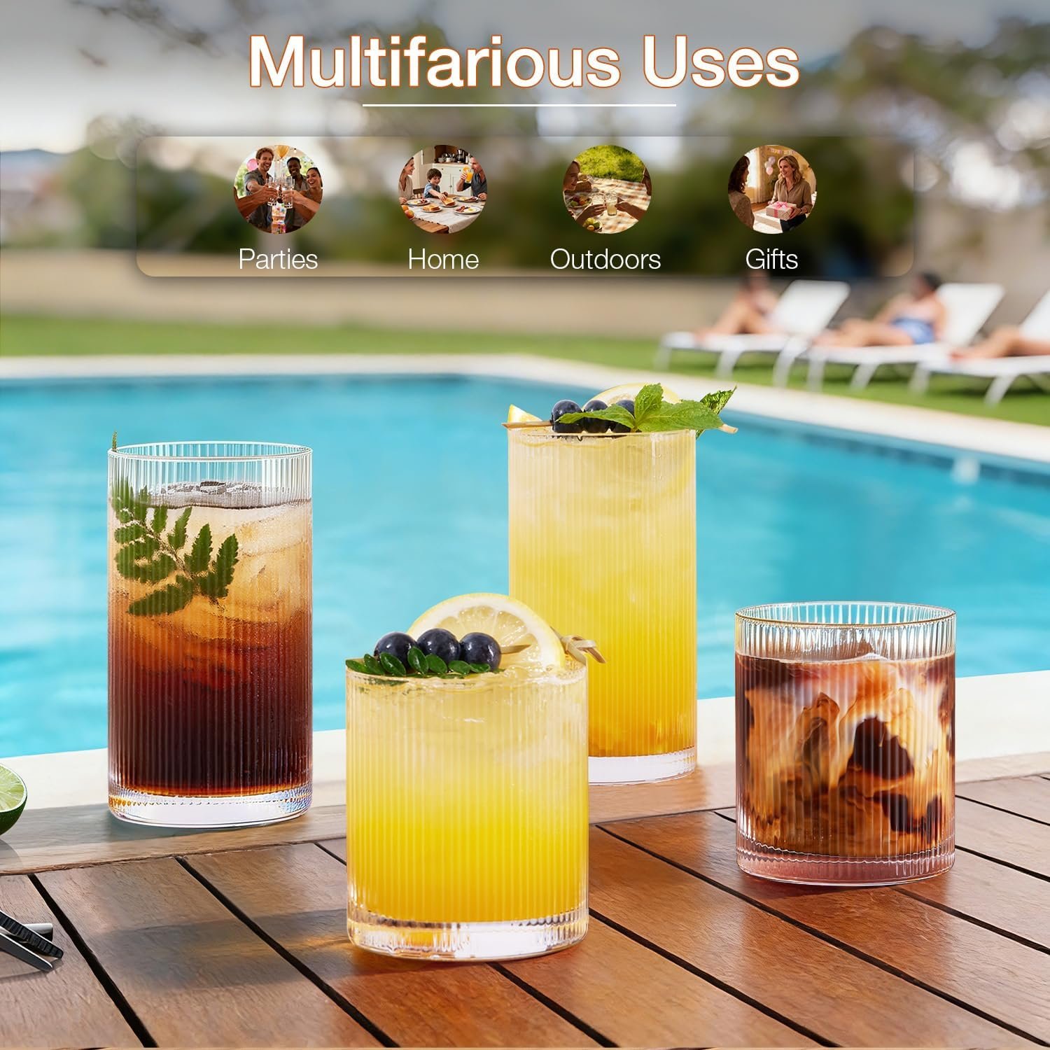 Suitable For Any Occasion:The elegant look of the vintage ribbed glassware Set will enhance the style of your drinkware collection, whether you’re sitting on the balcony sipping on a cold drink or enjoying a cocktail indoors, these glasses are ideal. Hosting a relaxed summer party or a formal dinner party will add to the ambiance. Perfect for cocktails, iced coffee, iced tea, sodas, water, juices and milkshakes.