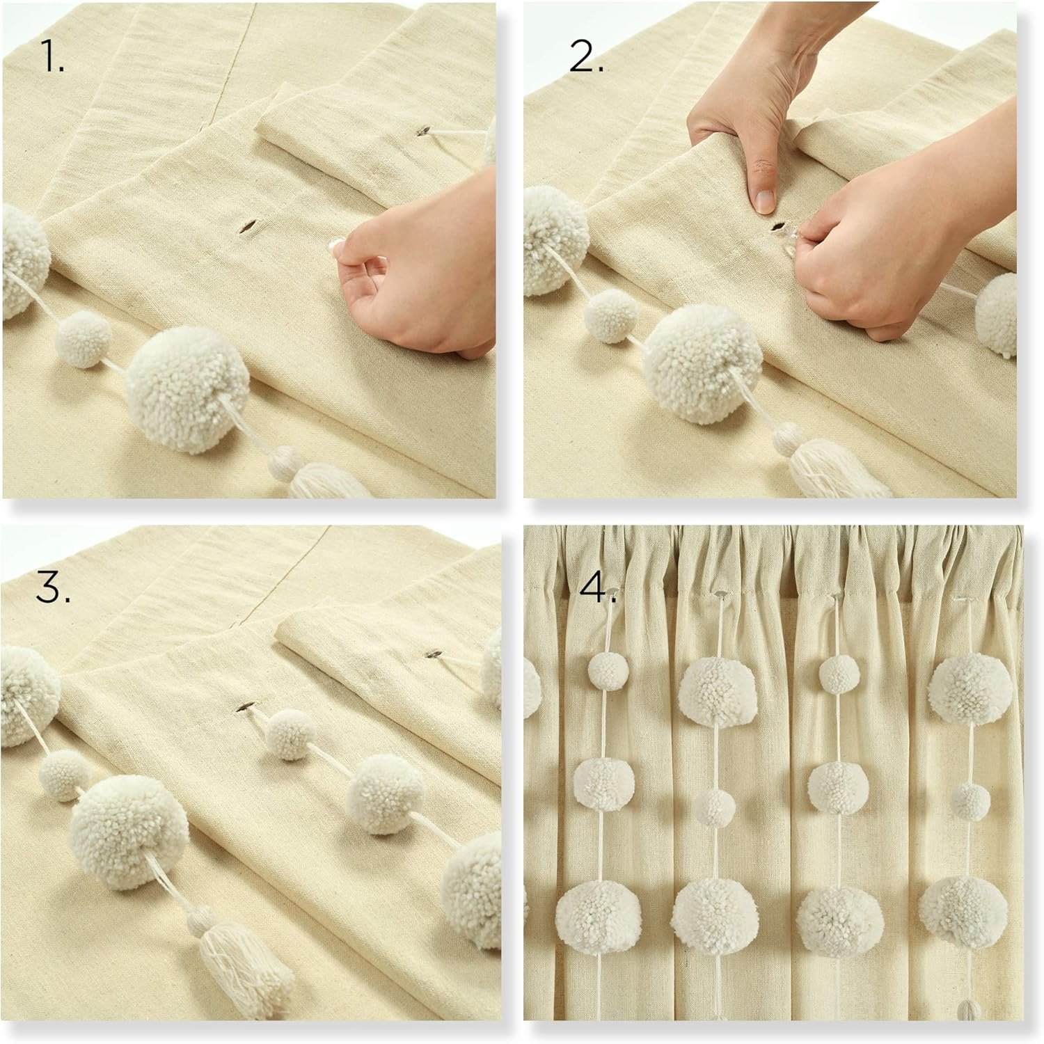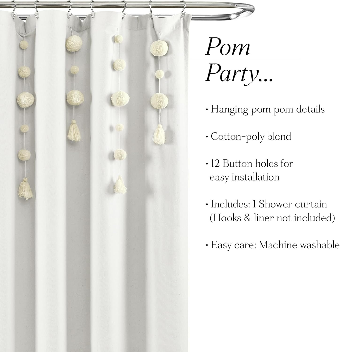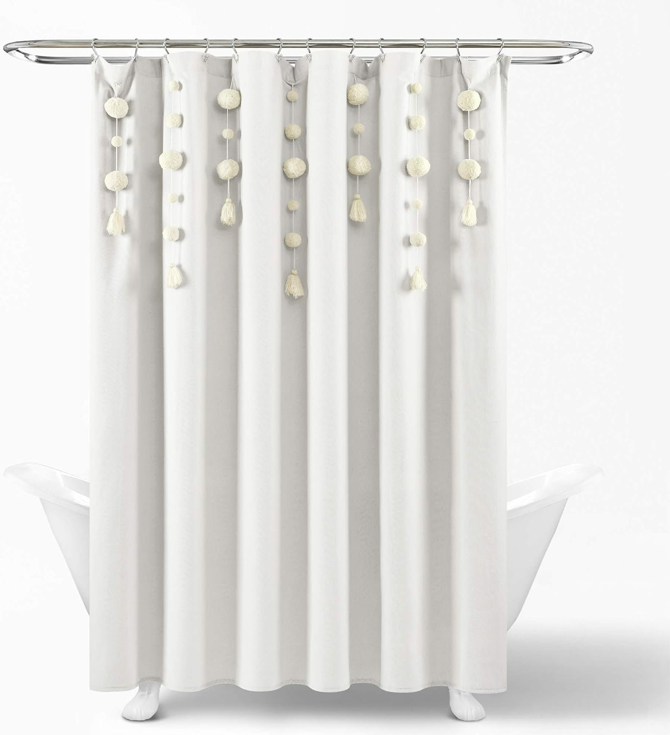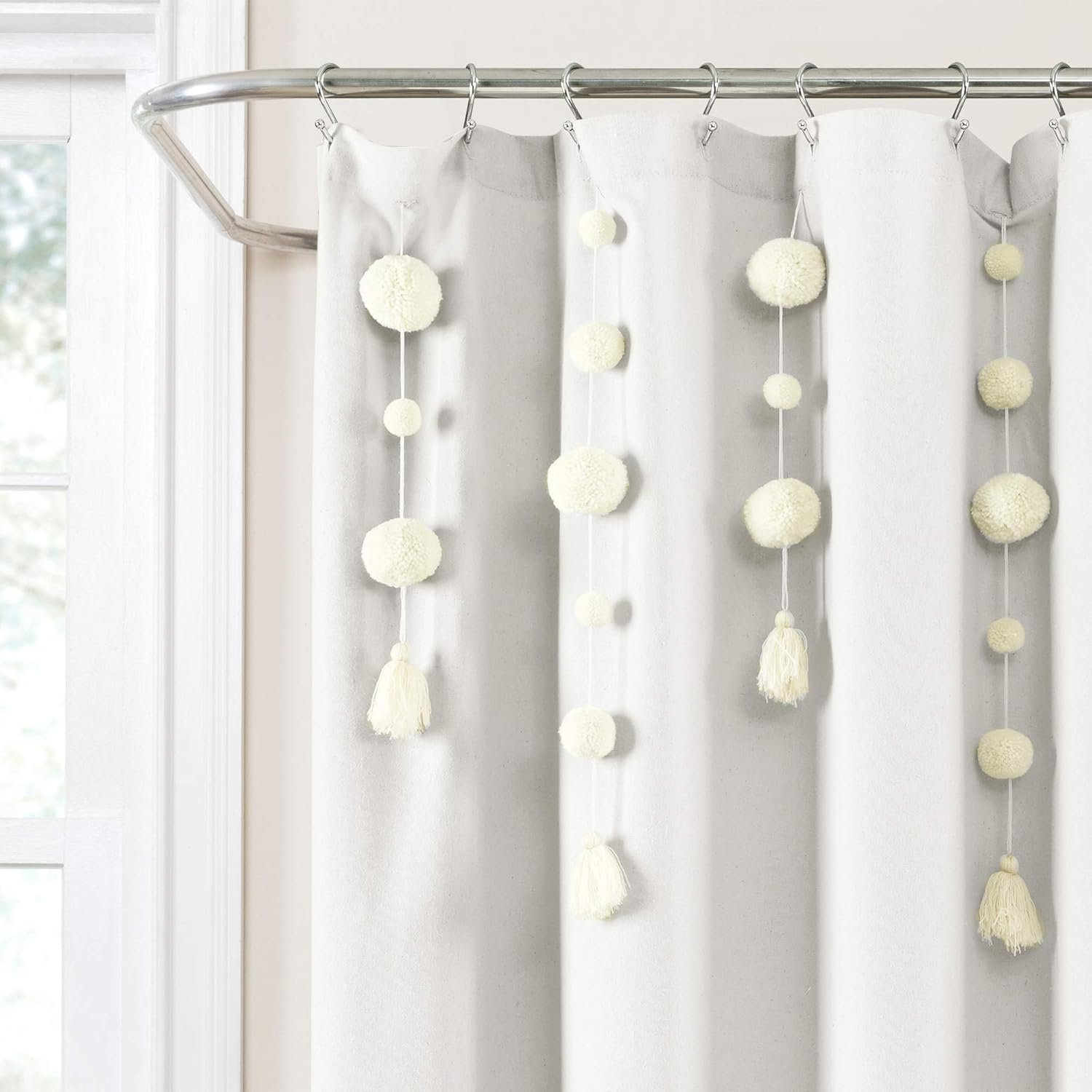 Bath Curtain: Add playful charm and soft textures to your bathroom decor with the Lush Decor Boho Pom Pom Tassel Linen Textured Shower Curtain. Neutral shades, linen-textured fabric, and removable pom pom tassels make up this whimsical bathroom curtain.